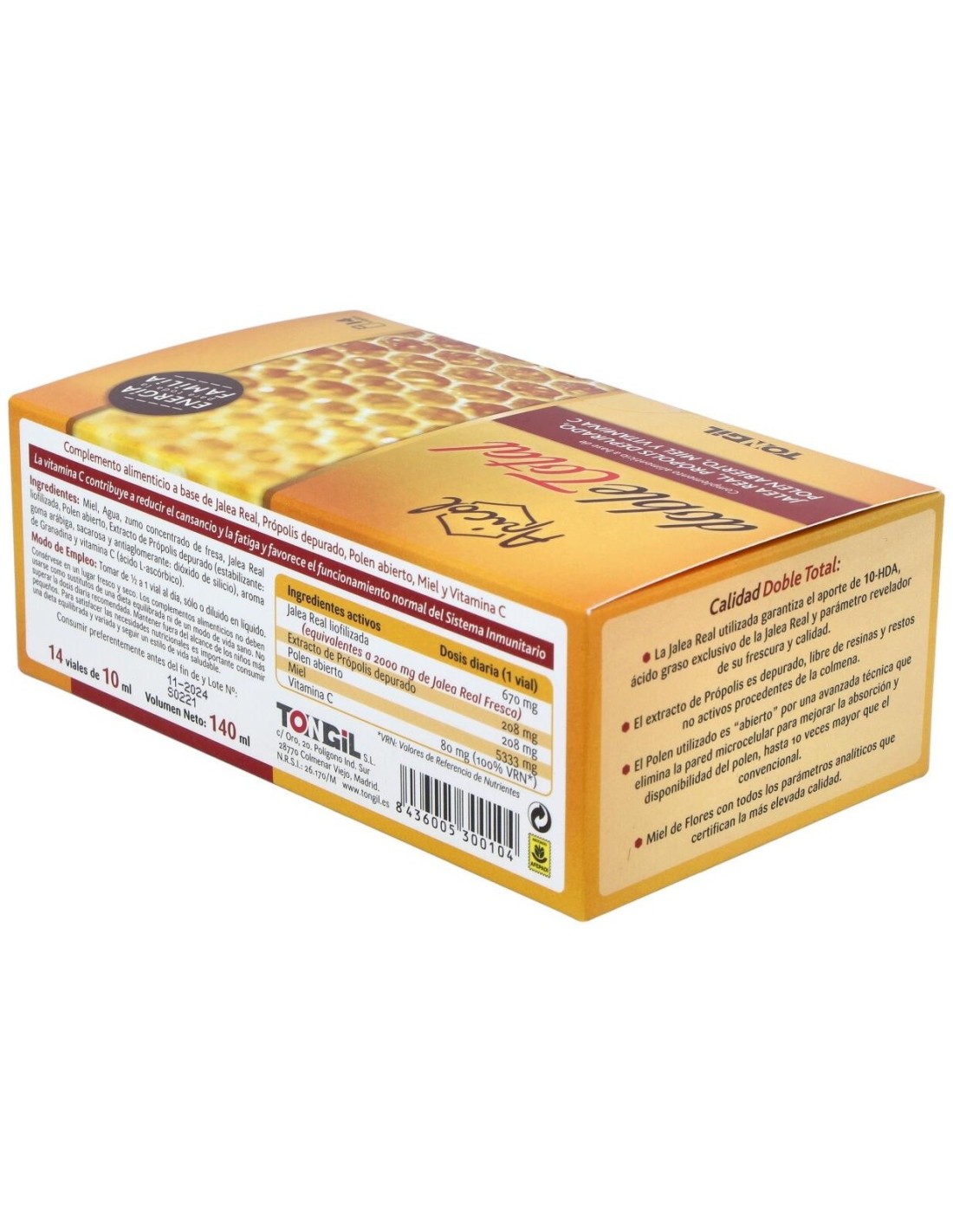 Por 1 vial: Miel (5333 mg), Jalea Real liofilizada 3:1 con un contenido en 10-HDA > 5% (670 mg)(equivalente a 2000 mg de Jalea Real fresca), Polen abierto (208 mg), Extracto de Própolis depurado (208 mg), Vitamina C (ácido L-ascórbico)(80 mg).
