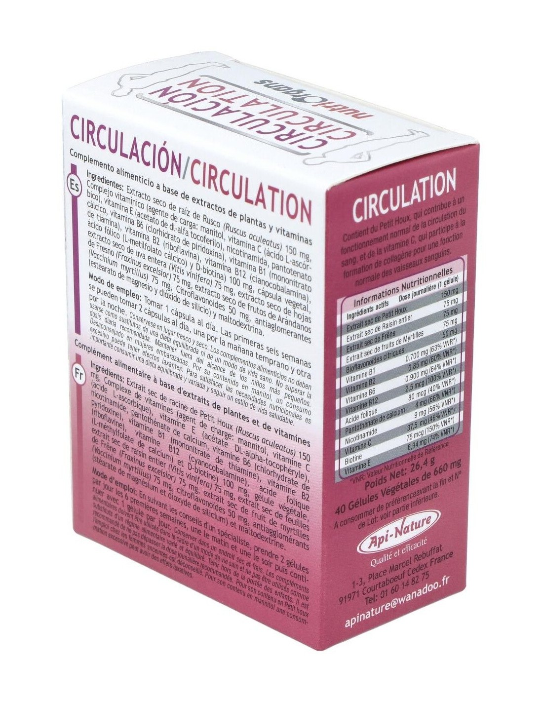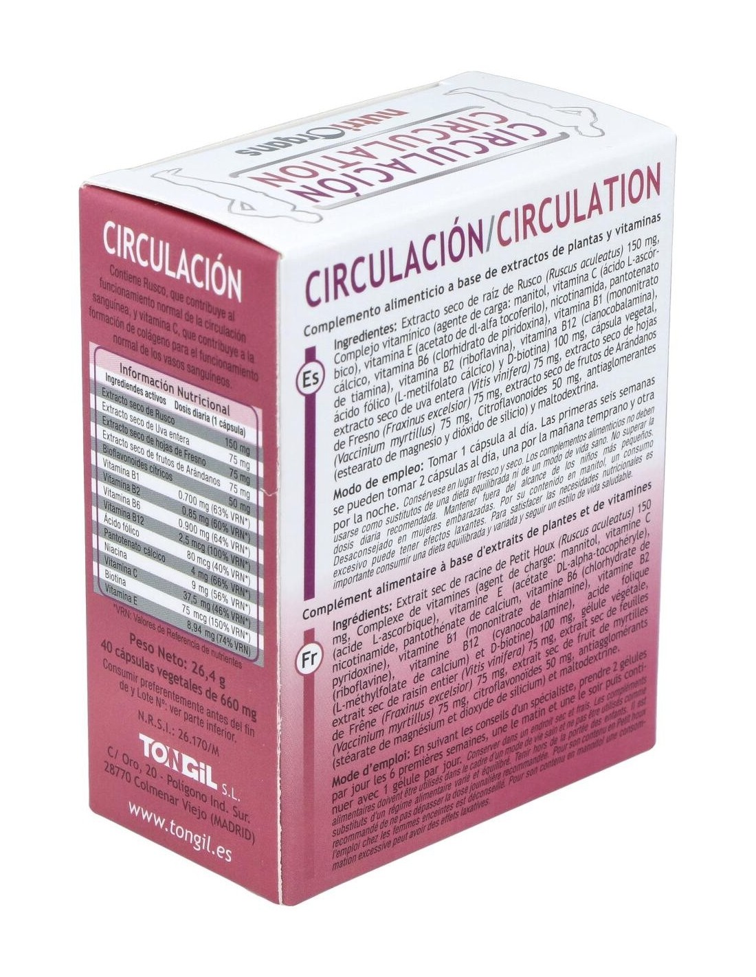 Complemento alimenticio a base de extractos de plantas y vitamina C. El Rusco alivia y proporciona una sensación de piernas ligeras. La Vid mantiene los vasos sanguíneos sanos y la integridad capilar. La Vitamina C contribuye a la formación normal de colágeno para el funcionamiento normal de los vasos sanguíneos. El Ginkgo favorece la circulación periférica.