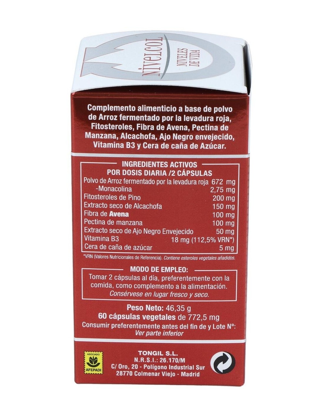 Polvo de arroz fermentado por la levadura roja, cápsula vegetal, fitosteroles de pino, polvo de alpiste, fibra de avena, pectina de manzana, extracto seco de alcachofa, extracto seco de bulbo de ajo negro envejecido, vitamina B3 (nicotinamida), antiaglomerante (dióxido de silicio), diluyente (maltodextrina), cera de caña de azúcar.