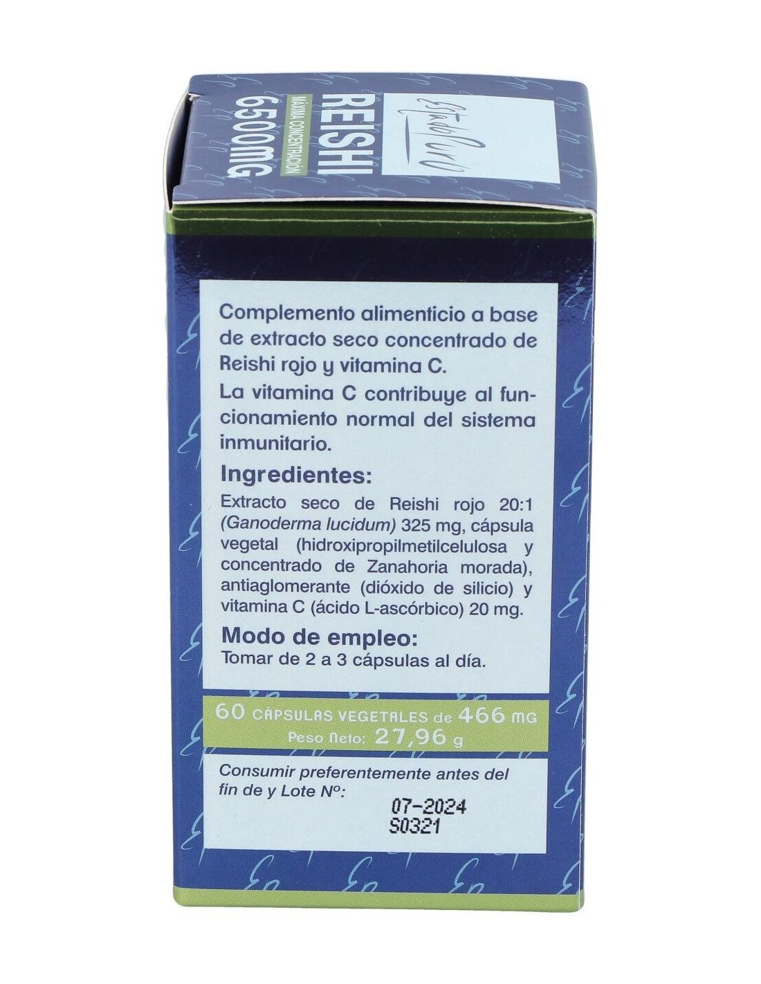 Extracto seco de Reishi rojo 20:1 (equivalente a 6500 mg de polvo de Reishi)........................................325 mg