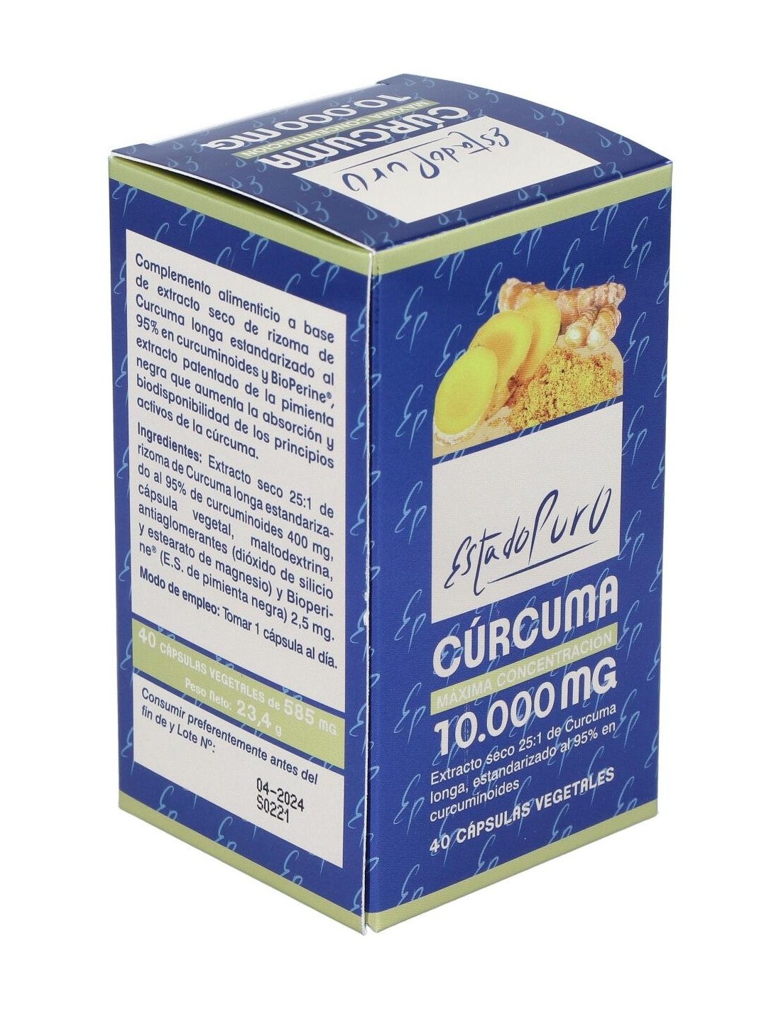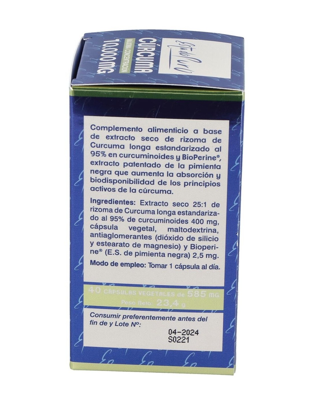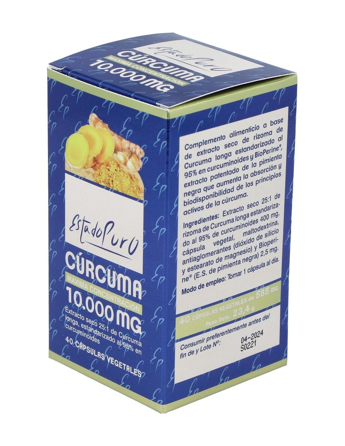 Extracto seco 25:1 de rizoma de Curcuma longa al 95% en curcuminoides (equivalente a 10.000 mg de polvo de rizoma de Cúrcuma).........400 mg