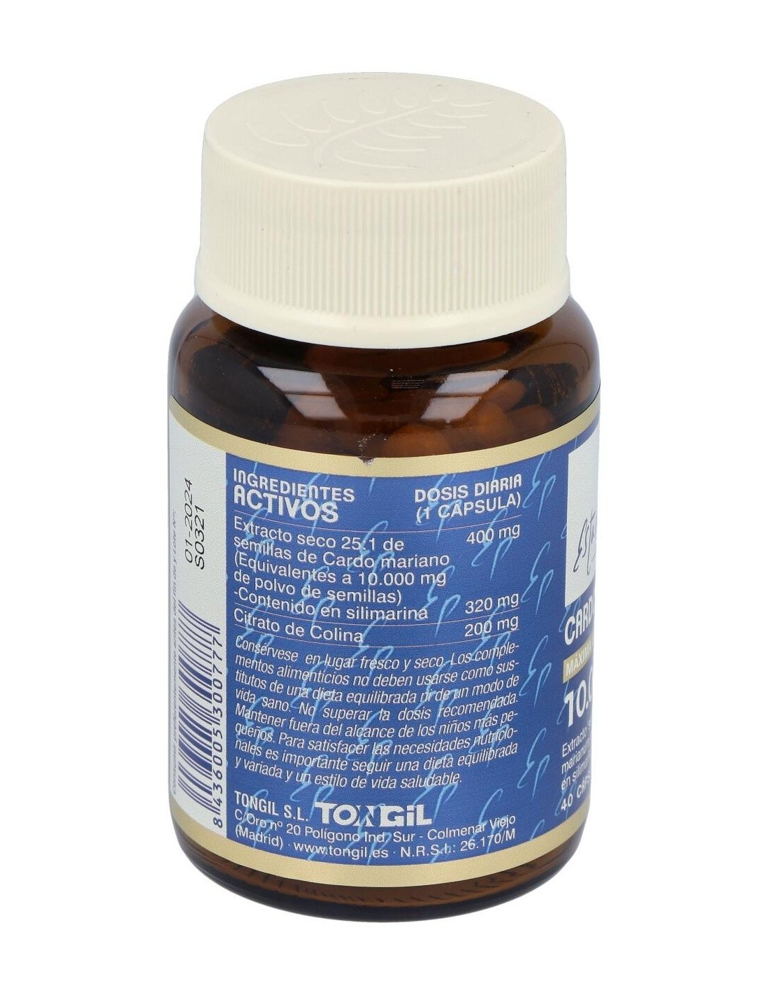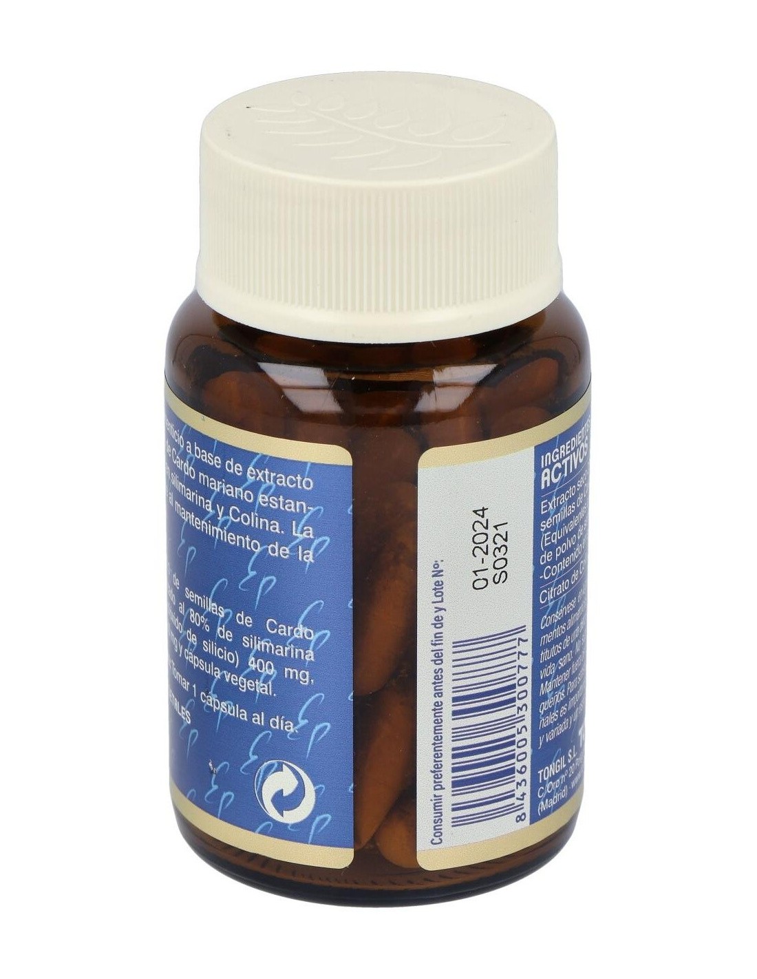 Por 1 cápsula: Extracto seco 25:1 de semillas de Cardo mariano (Equivalentes a 10.000 mg de polvo de semillas) (400 mg): Contenido en silimarina (320 mg), Citrato de Colina (200 mg).