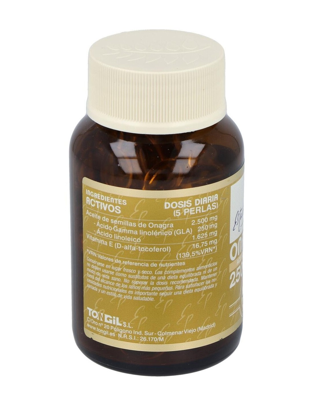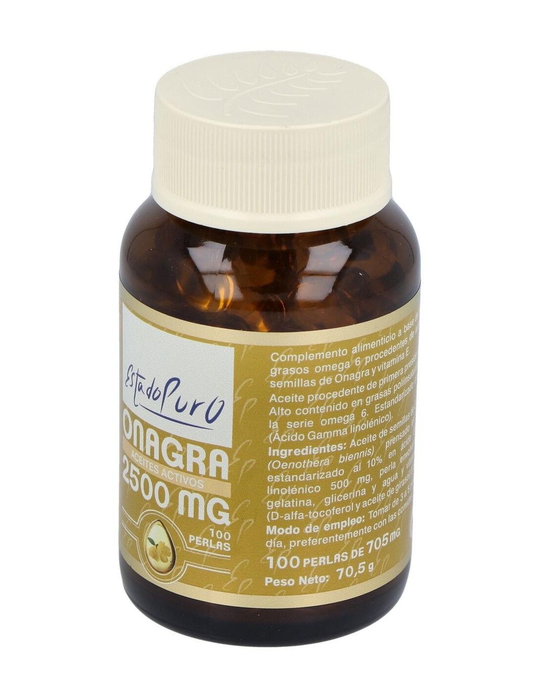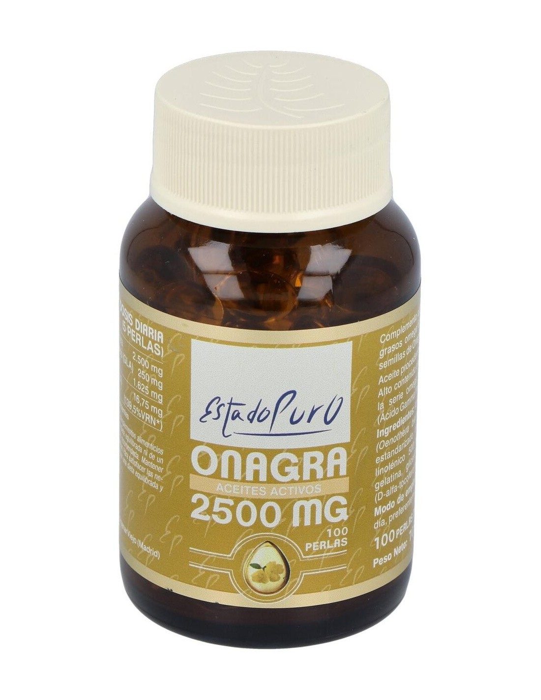 Aceite de semillas de Onagra (Oenothera biennis) prensado en frío y estandarizado al 10% en ácido Gamma linolénico 500 mg, perla envolvente de gelatina, glicerina y agua y vitamina E (D-alfa-tocoferol y aceite de girasol) 5 mg.