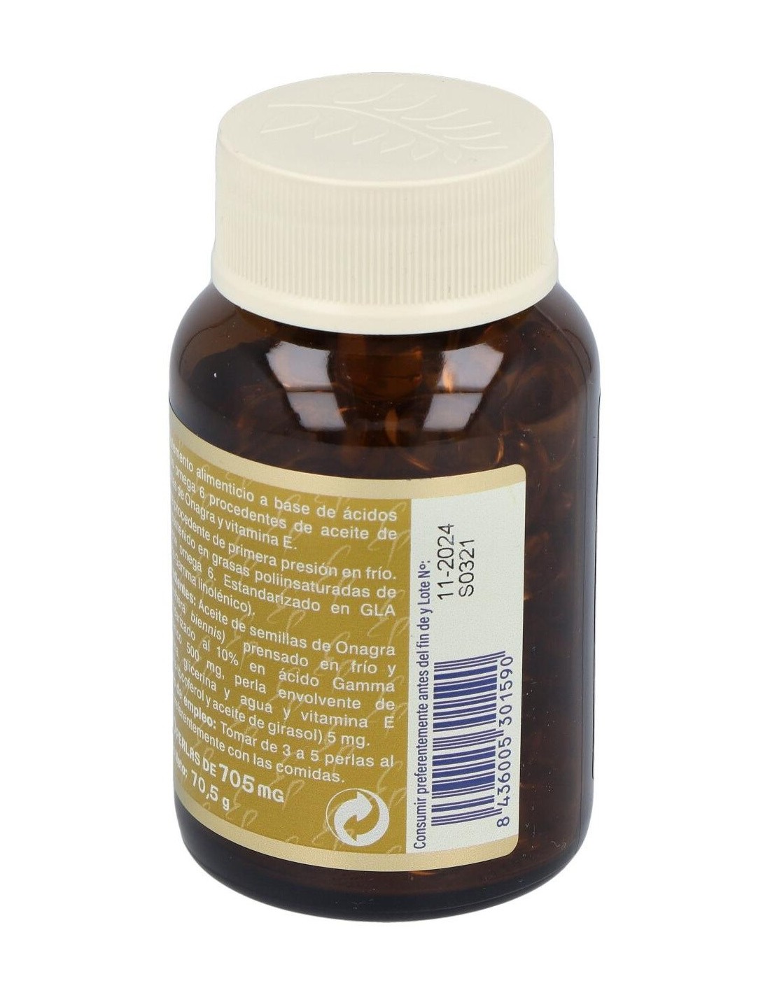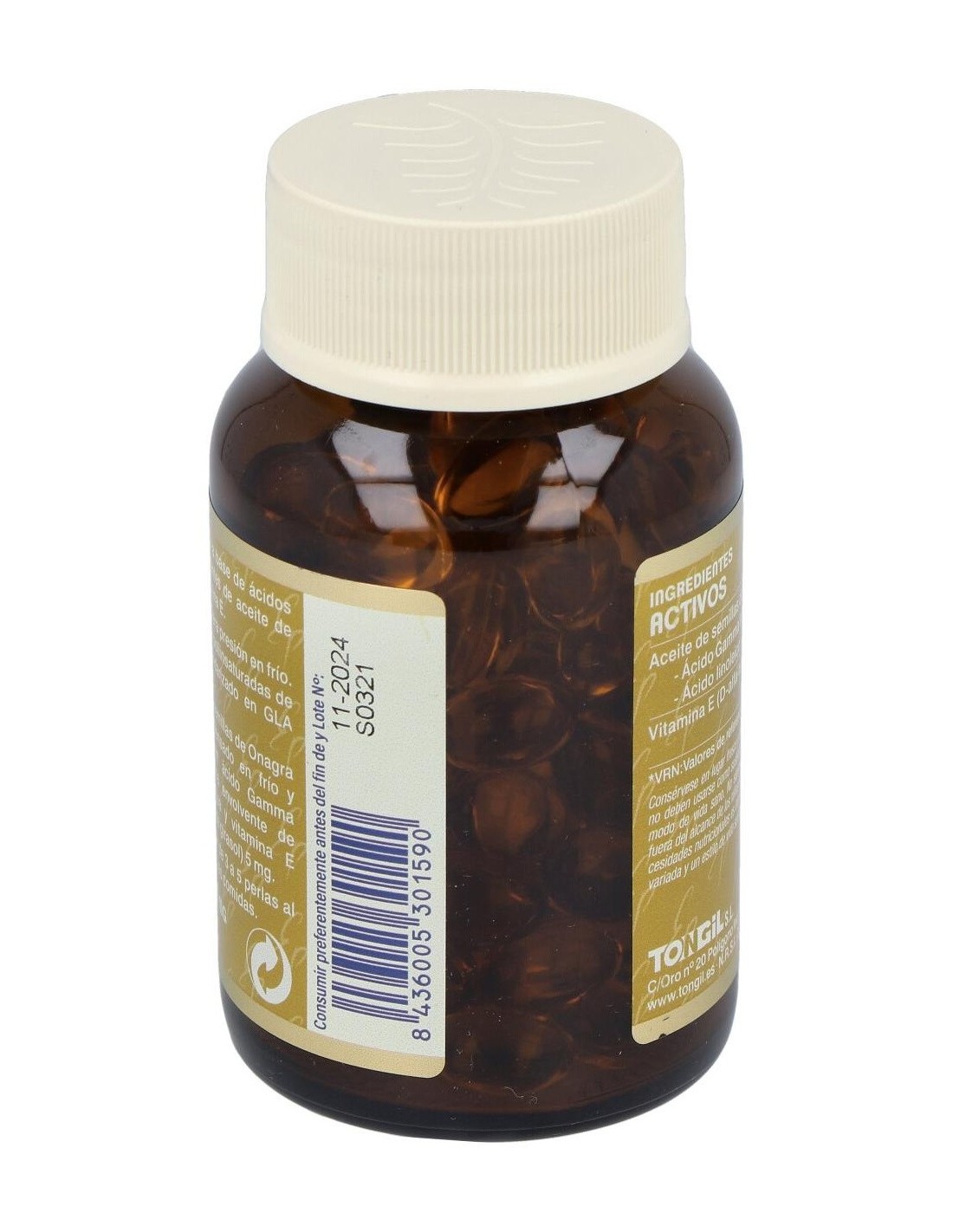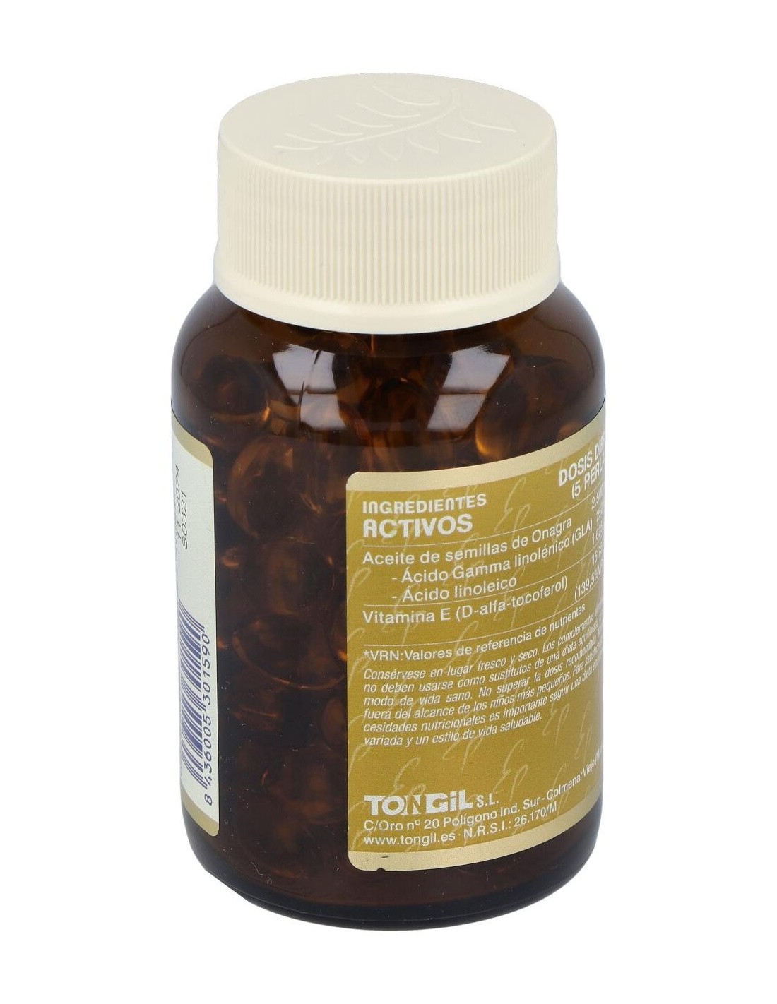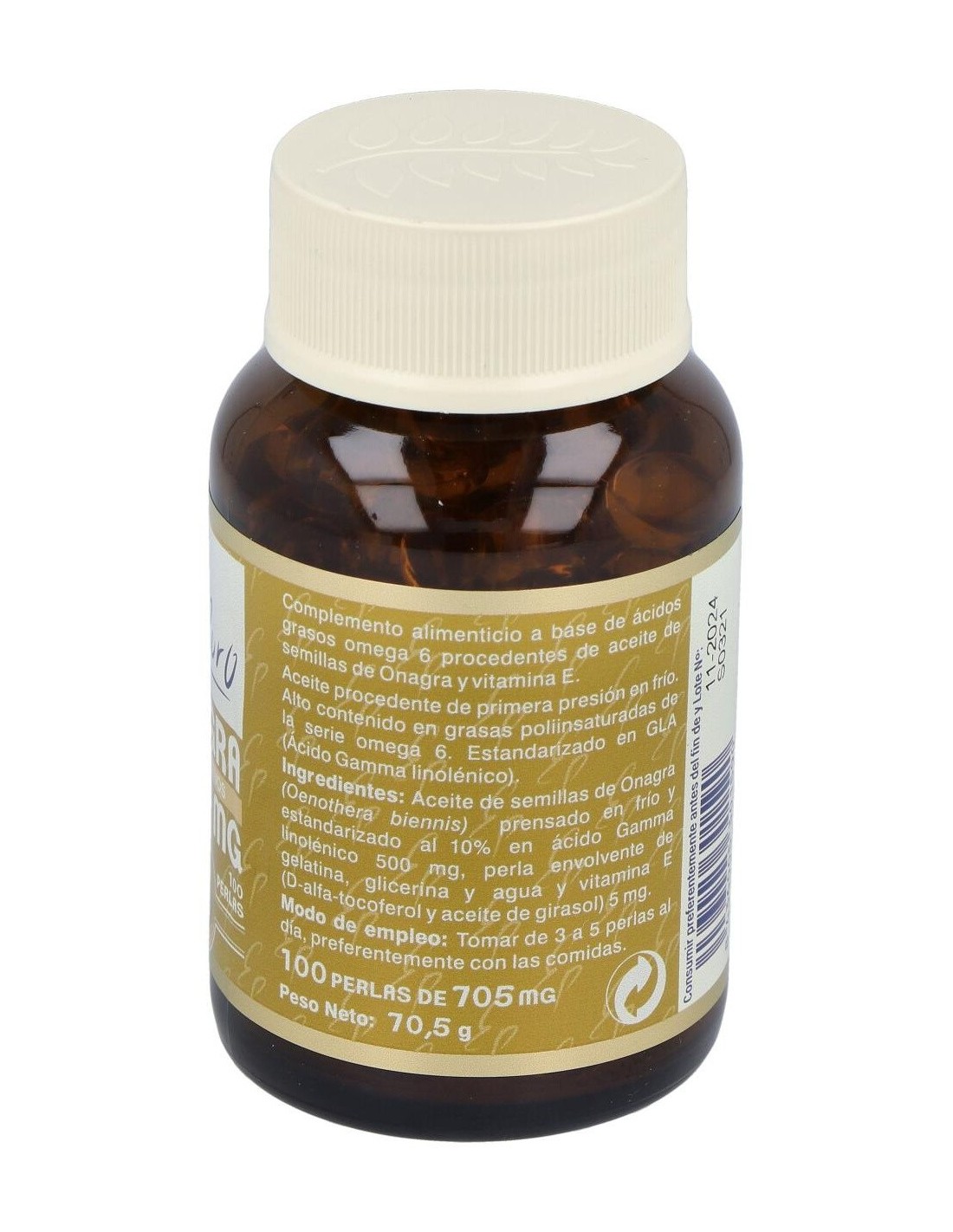 Aceite de semillas de Onagra (Oenothera biennis) prensado en frío y estandarizado al 10% en ácido Gamma linolénico 500 mg, perla envolvente de gelatina, glicerina y agua y vitamina E (D-alfa-tocoferol y aceite de girasol) 5 mg.