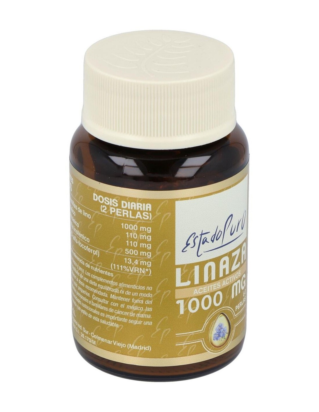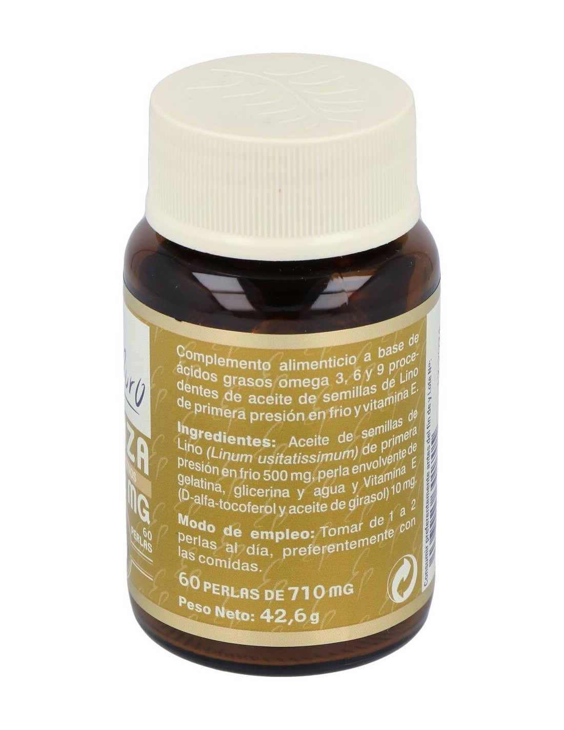 Aceite de semillas de Lino (Linum usitatissimum) de primera presión en frío 500 mg, perla envolvente de gelatina, glicerina y agua y Vitamina E (D-alfa- tocoferol y aceite de girasol) 10 mg.