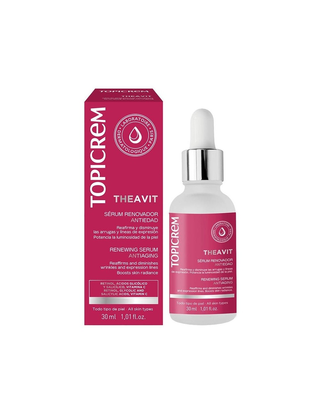 TOPICREMSérum facial intensivo antienvejecimiento y antioxidante. Gel intensivo con alta concentración de activos renovadores y antioxidantes que protegen frente al fotoenvejecimiento. Corrige de forma intensa los signos del envejecimiento cronológico y fotoenvejecimiento cutáneo, a través de tres acciones específicas: renovadora, anti radicales y dermoprotectora.