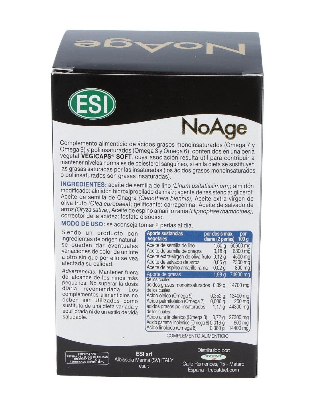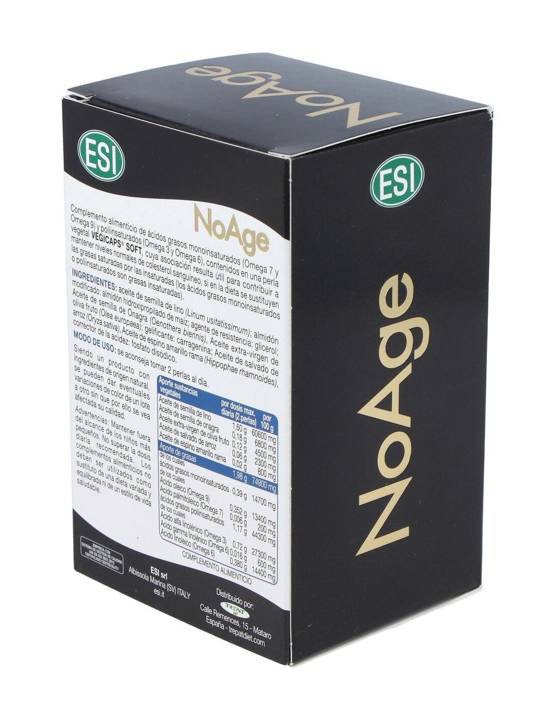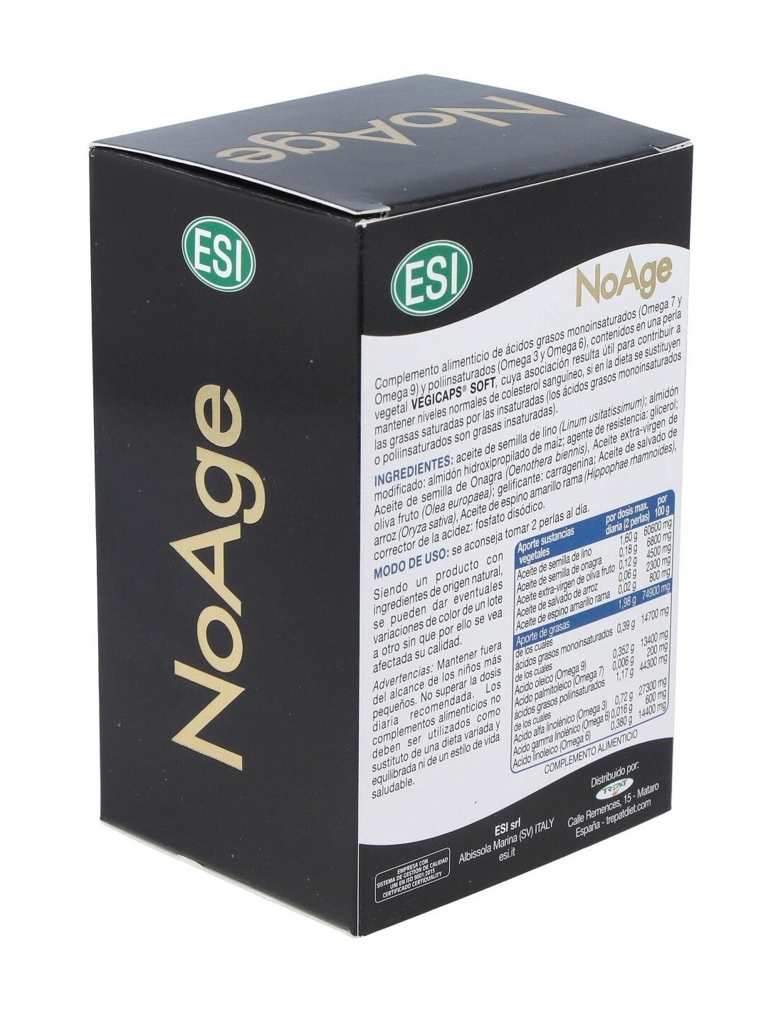 Las perlas NoAge de ESI es un complemento alimenticio recomendado como tratamiento coadyuvante en casos de vejez: pérdidas de memoria, reducción de arrugas o manchas y protección vascular y arterial. Elaborado con un alto contenido de Omega 3, 6, 7 y 9, ácidos grasos mono y pilinsaturados.