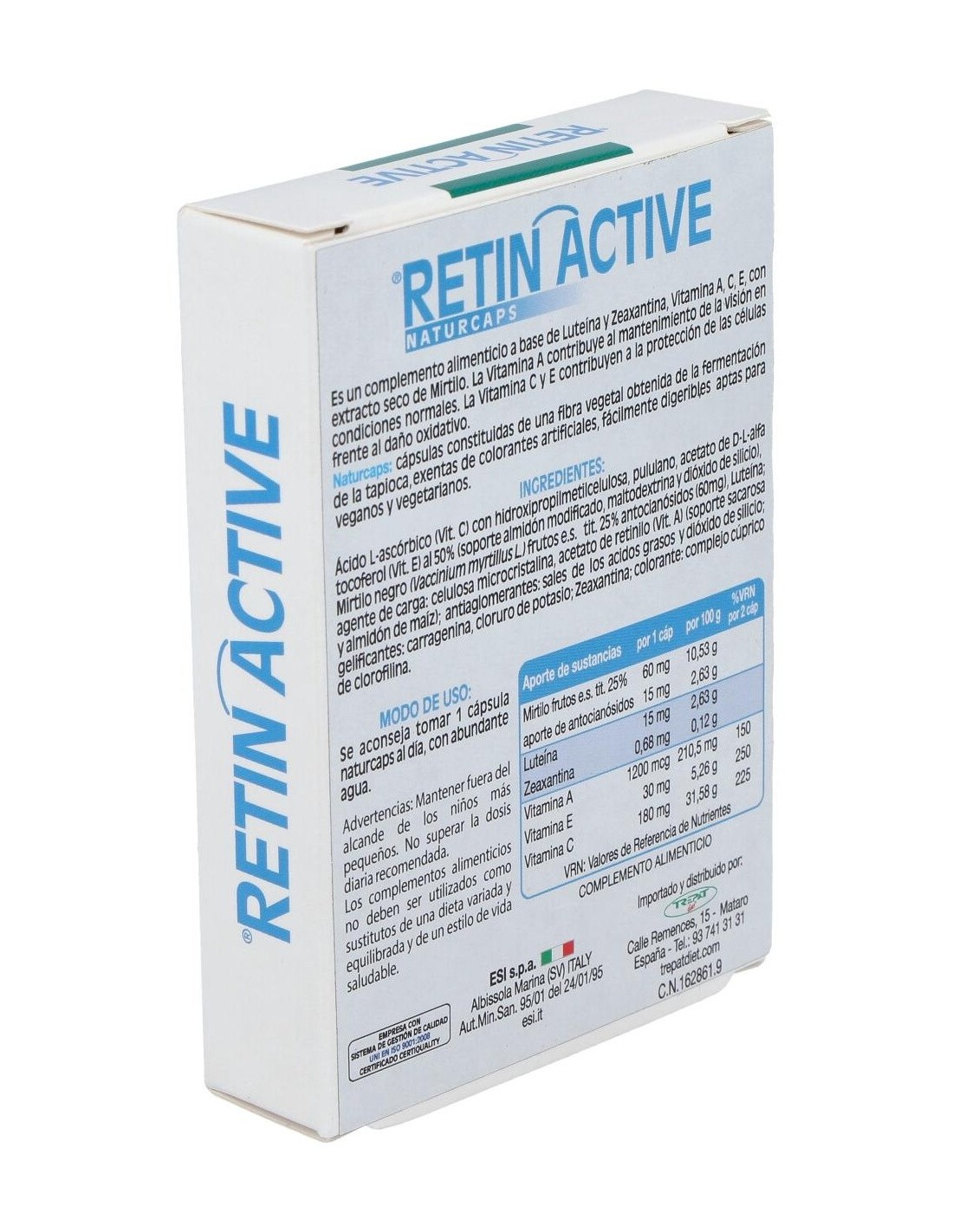Retin Active es un complemento alimenticio especialmente formulado para conseguir beneficiar a la actividad visual. Gracias a su formulación rica en arándanos, vitaminas antioxidantes A, C, y E, y un gran aporte de luteína unida a zeaxantina, consigue proteger la estructura ocular.