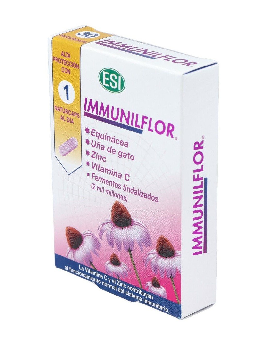 La fórmula de Immunilflor de laboratorios ESI contiene: Equinácea Purpúrea, potencia la acción de los macrófagos paraprevenir eficazmente a nuestro organismo de virus y bacterias; Vitamina C, incrementa las defensas inmunitarias y la creación de anticuerpos; Uña de Gato, estimula el sistema inmune; Equinácea Angustifolia, evita que se extiendan las infecciones, incluso en la dermis y refuerza las defensas de la piel, evitando que penetren en ella organismos; Fermentos lácticos, llegan intactos al intestino, favoreciendo las defensas inmunitarias.