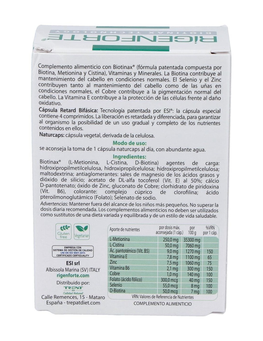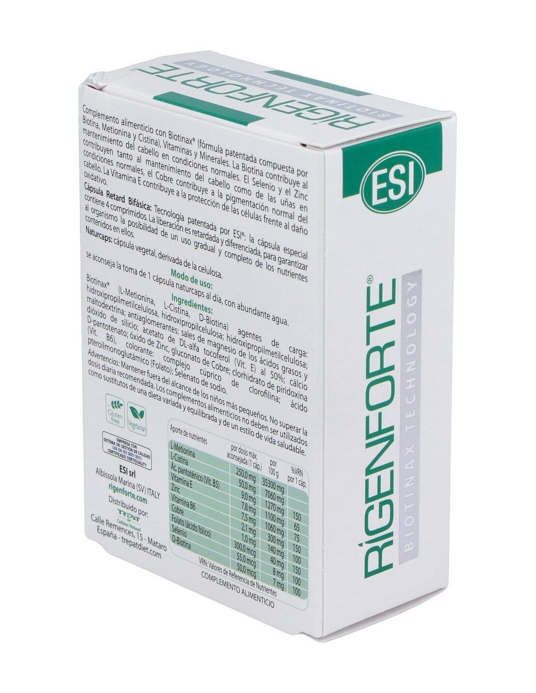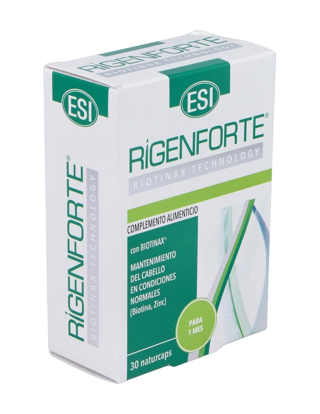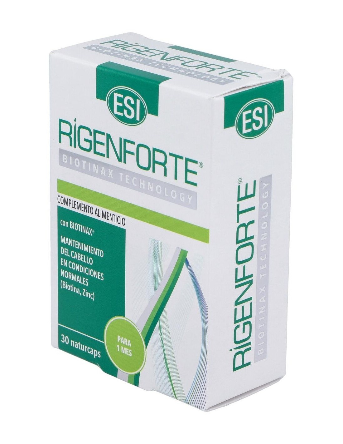 Las cápsulas Rigenforte de ESI son un complemento alimenticio que ayuda a fortalecer el cabello (y previene su caída) y las uñas gracias a su acción reparadora a base de Biotinax®, vitaminas, minerales y aminoácidos.