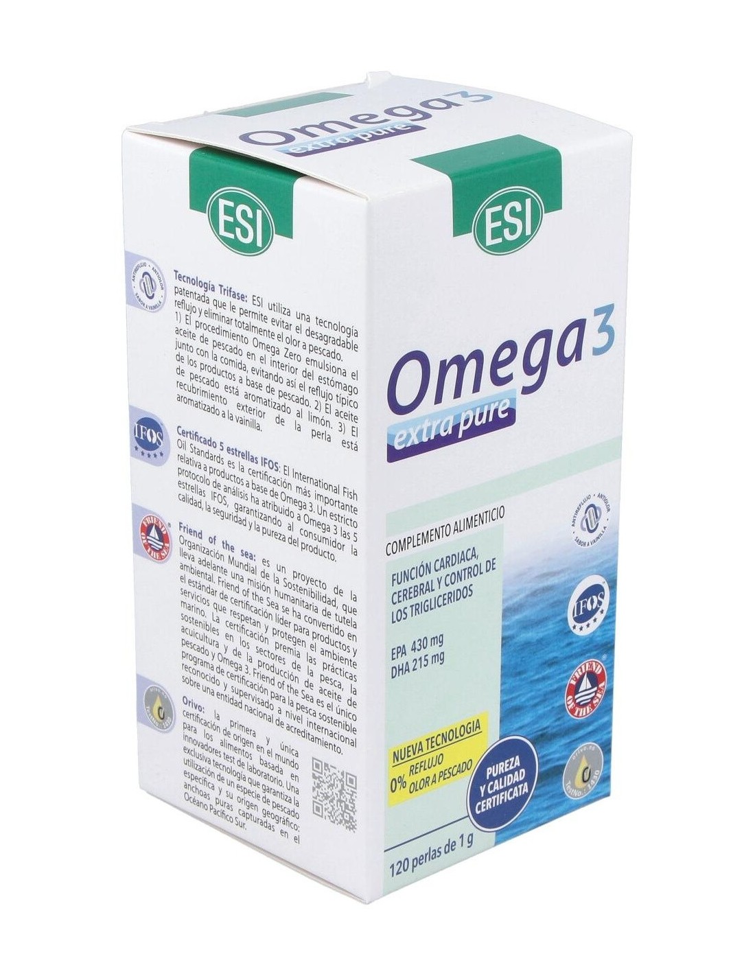 Suplemento a base de aceite puro concentrado de pescado (procedente del océano pacífico) rico en ácidos grasos poliinsaturados de la serie Omega 3, estandarizado y altamente concentrado. El producto se presenta en forma de perlas con una tecnología antirreflujo. La alta concentración y pureza está avalada por la certificación 5 estrellas IFOS que garantiza la calidad, seguridad y pureza del producto. Omega 3 extra pure se presenta en forma de ácidos grasos libres naturales. No contiene dioxinas ni metales pesados.