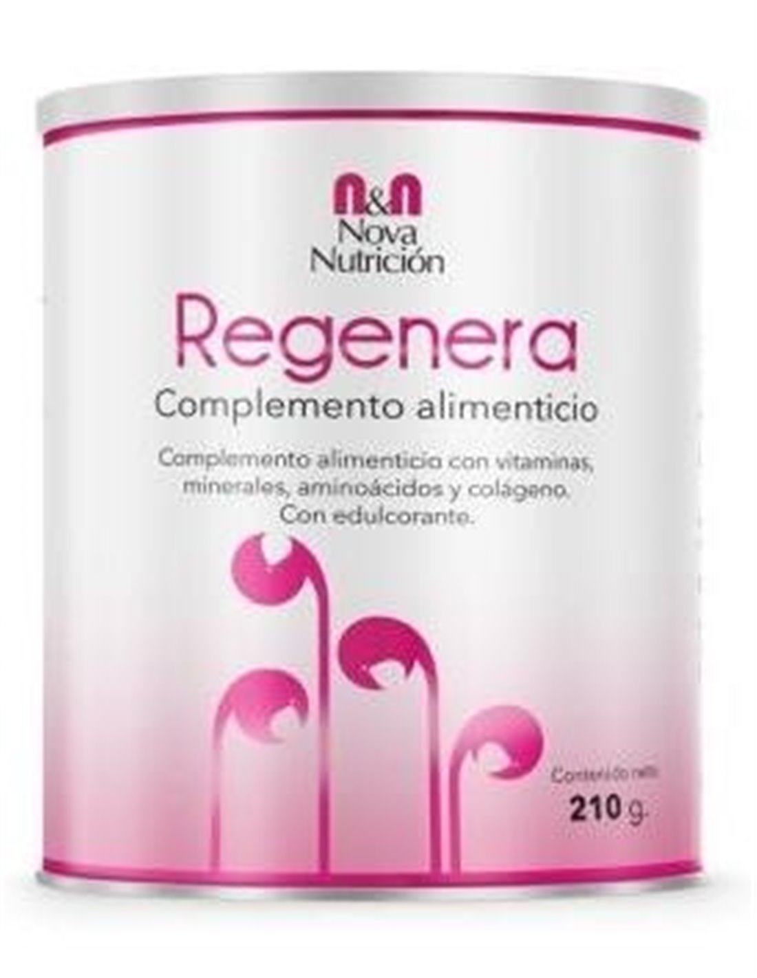 UGA NUTRACEUTICALSRegenera es un complemento alimenticio a base de péptidos de colágeno, aminoácidos, vitaminas y minerales. Viene en un cómodo formato en polvo con un dosificador y un delicioso sabor a frutos rojos. Los péptidos de colágeno ÜNIK de fácil asimilación, están reforzados con glicina, el aminoácido más abundante del colágeno. El zinc, el magnesio y la vitamina K contribuyen al mantenimiento de los huesos. Regenera contiene vitamina K en forma de menaquinona-7 (MK-7). Vitaminas del grupo B son, en general, cofactores para la síntesis de proteínas y el normal funcionamiento del metabolismo. El folato está presente en su forma metilada L-metilfolato cálcico (Metafolin®).