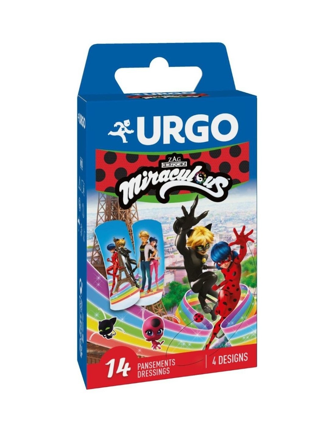 URGOApósitos con 4 diseño impresos: Ladybug, Cat Noir, Ladybug y Cat Noir juntos y Marinette y Adrien juntos. El soporte impermeable es apto para el baño y otras actividades.