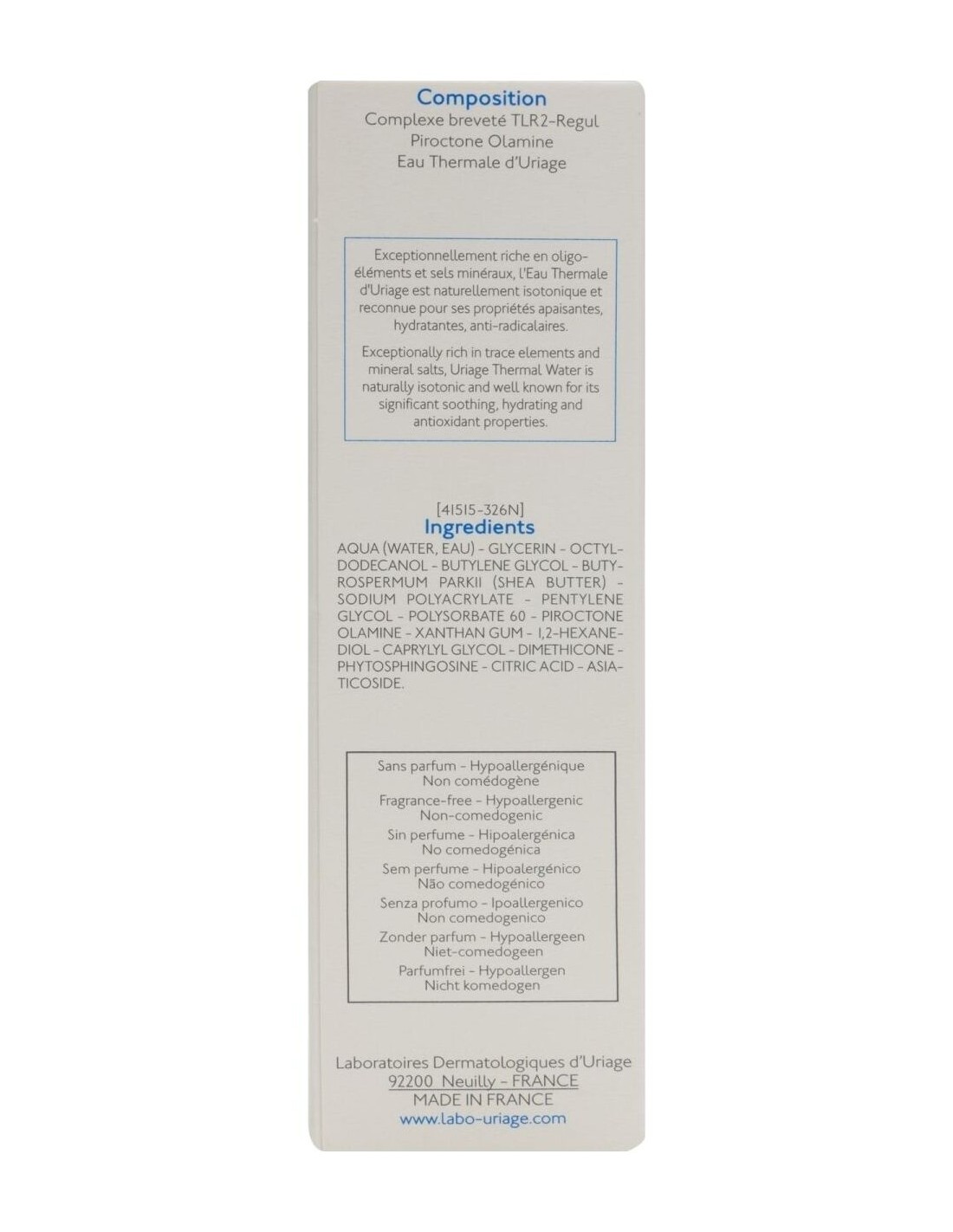 AQUA. URIAGE THERMAL SPRING WATER. GLYCERIN. OCTYLDODECANOL BUTYLENE GLYCOL. BUTYROSPERMUM PARKII BUTTER. SODIUM POLYACRYLATE. PENTYLENE GLYCOL. POLYSORBATE 60. PIROCTONE OLAMINE. XANTHAN GUM. HEXANEDIOL. CAPRYLYL GLYCOL. DIMETHICONE. PHYTOSPHINGOSINE. CITRIC ACID. ASIATICOSIDE.