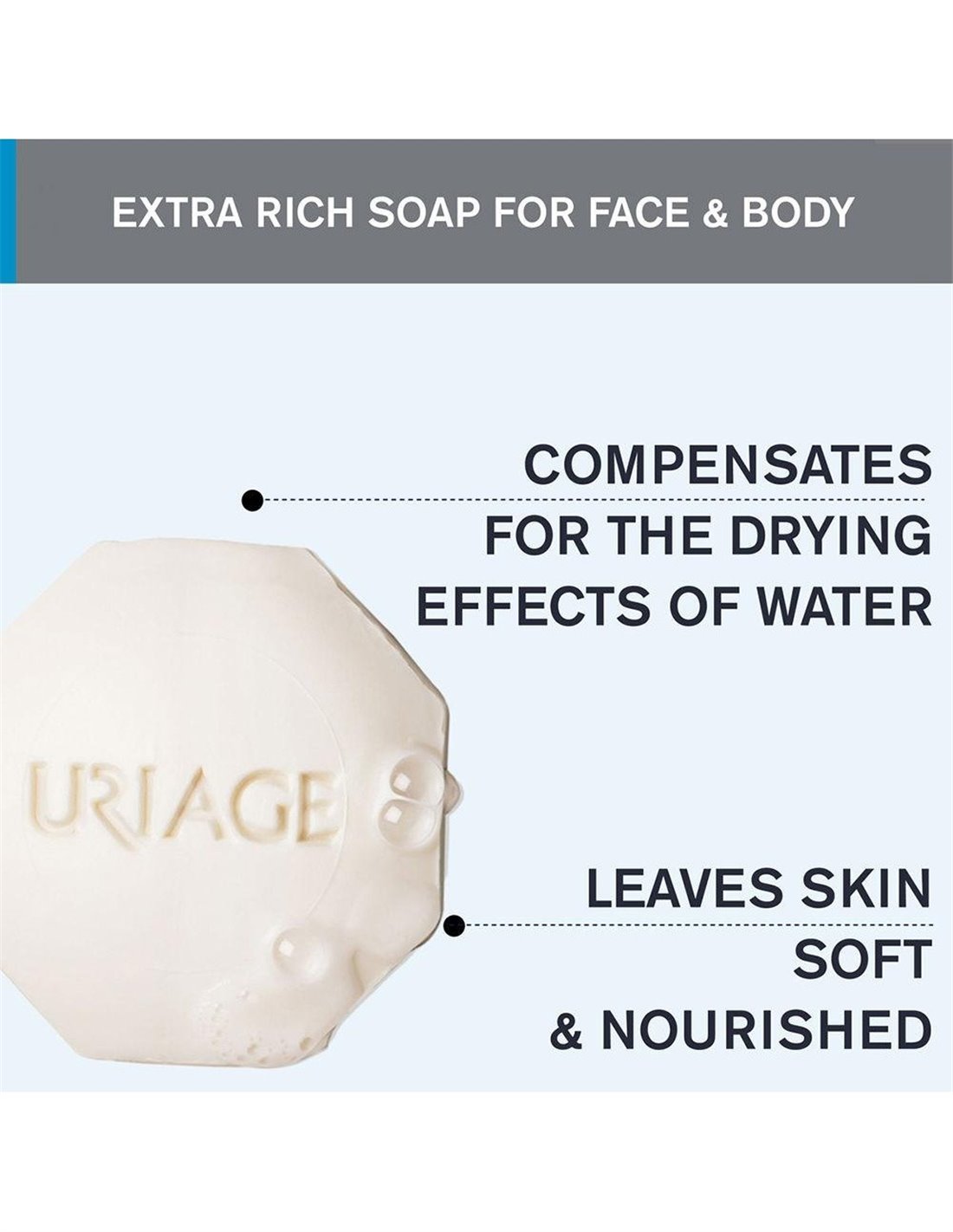 URIAGEEsta barra dermatológica sin jabón, con un delicado perfume, limpia la piel sin secarla y respeta su película hidrolipídica. Respeta al máximo el equilibrio de la piel y compensa el efecto de sequedad que provoca el exceso de cal en el agua.