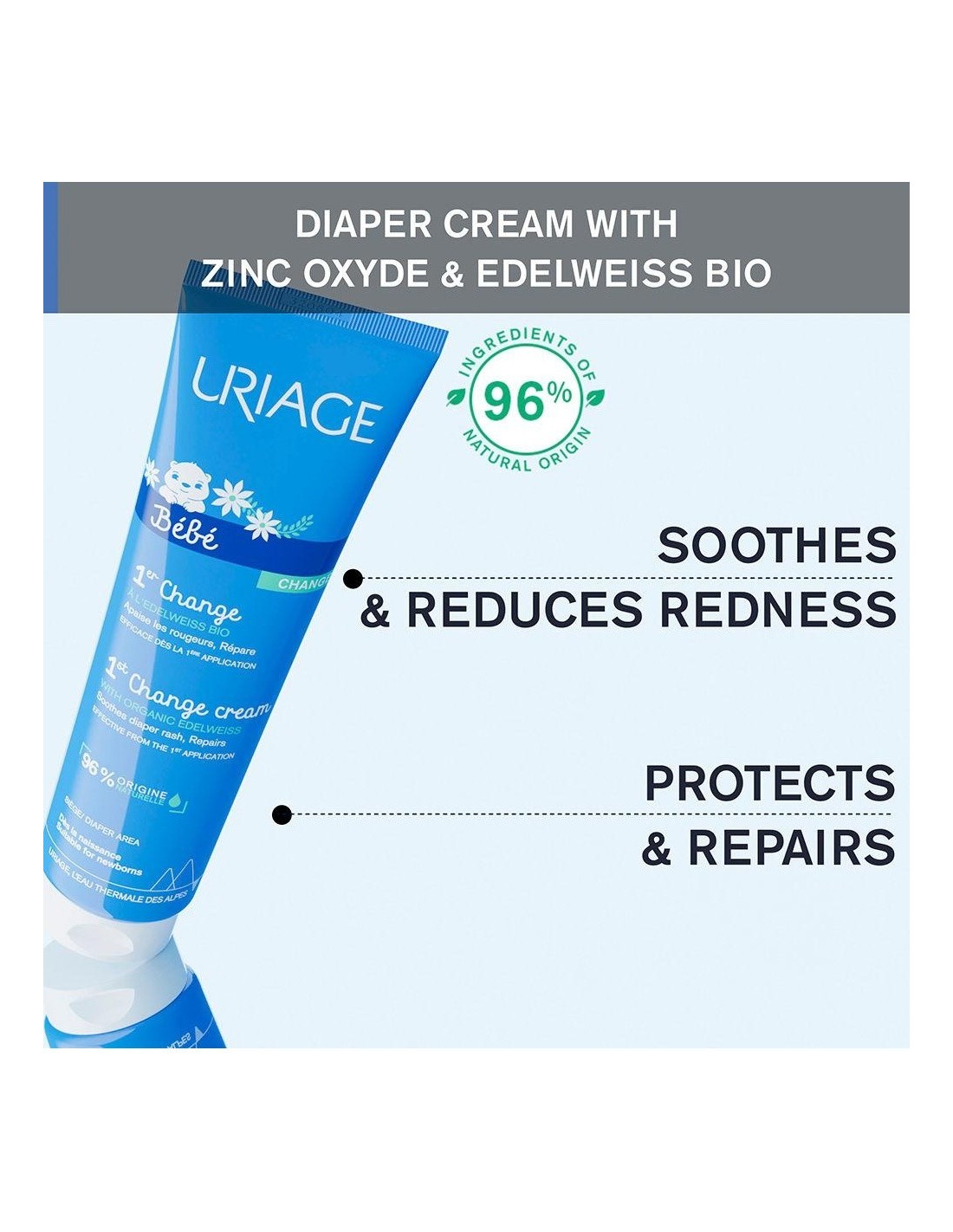 URIAGEEsta crema previene eficazmente la aparición de rojeces y repara la epidermis debilitada a diario por los pañales. Su fórmula, que incluye el complejo natural [Agua termal de Uriage + Edelweiss orgánico] alivia la sensación de disconfort, ayuda a reducir las rojeces y refuerza la barrera cutánea. Enriquecida con óxido de zinc y cera de abeja, aísla la superficie de la piel de forma no oclusiva y ayuda a repararla dejando una película protectora invisible. La piel queda calmada y protegida.