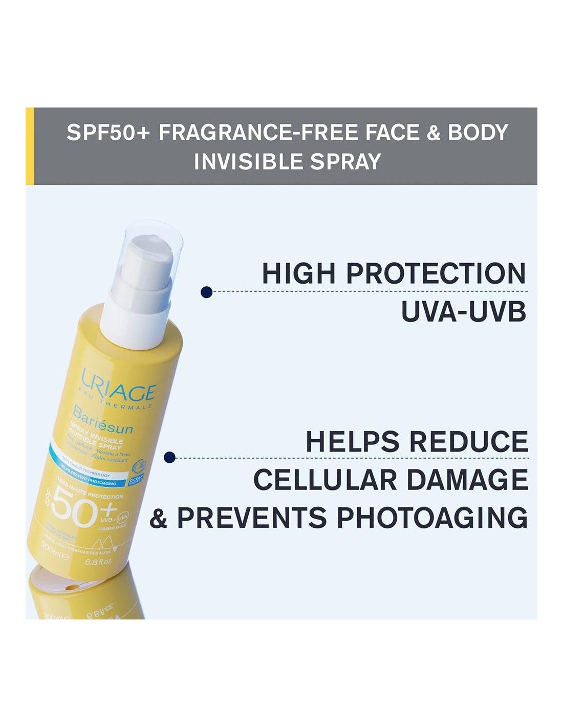 URIAGECombina un complejo de filtros de muy alto rendimiento y dos patentes dermatológicas para proteger la piel, prevenir el daño celular y el fotoenvejecimiento causado por los rayos UVA y UVB y la luz azul. Este spray de muy alta protección con una textura ligera garantiza un acabado invisible cada vez que se aplica. Este producto de protección solar proporciona una alta seguridad y una alta tolerancia.