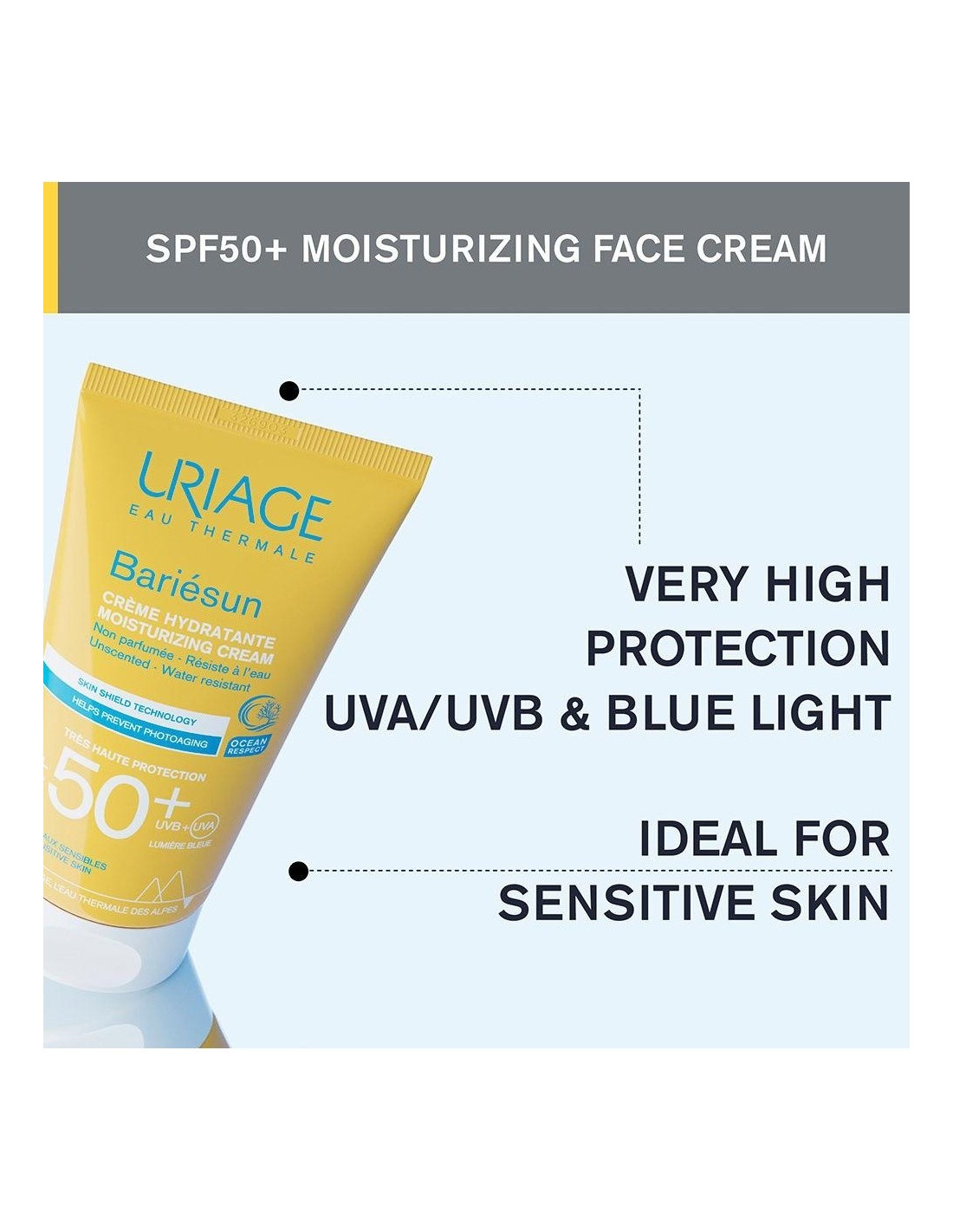 URIAGECombina un complejo de filtros de muy alto rendimiento y dos patentes dermatológicas para proteger la piel, prevenir el daño celular y el fotoenvejecimiento causado por los rayos UVA y UVB y la luz azul. Esta crema de alta protección con una textura ligera garantiza un acabado invisible. Esta crema proporciona una alta seguridad y una alta tolerancia.