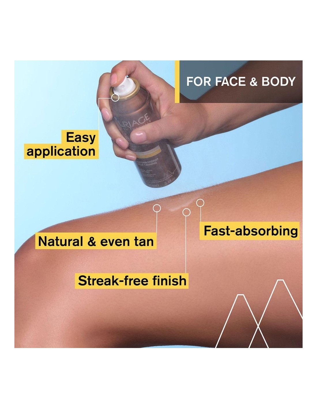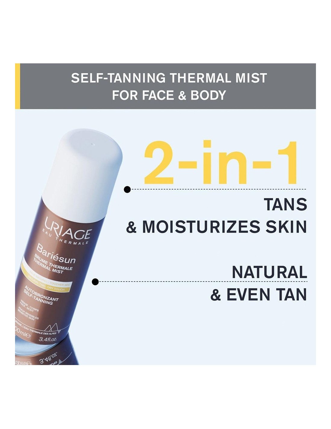 URIAGEIlumina la piel y proporciona un bronceado natural y uniforme después de sólo una hora. Este práctico frasco pulverizador multiposición permite una difusión óptima. Su textura fluida, no grasa y agradablemente perfumada garantiza un renovado placer de uso cada vez que se aplica.