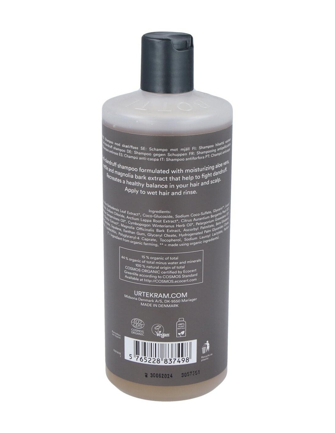 Champú de ortiga anticaspa. Utilizada durante miles de años en la medicina tradicional de las plantas, el extracto de ortiga junto con un cóctel de principios vegetales dan nueva vida al cabello. Extracto de bardana, aceites de ciprés, de geranio rosa, de bergamota y de citronela actúan junto con el aloe vera en este champú. Con agentes limpiadores tensioactivos suaves de origen vegetal que limpian eficazmente. COSMOS ORGANIC certificado por Ecocert Greenlife. Vegano. No testado con animales.