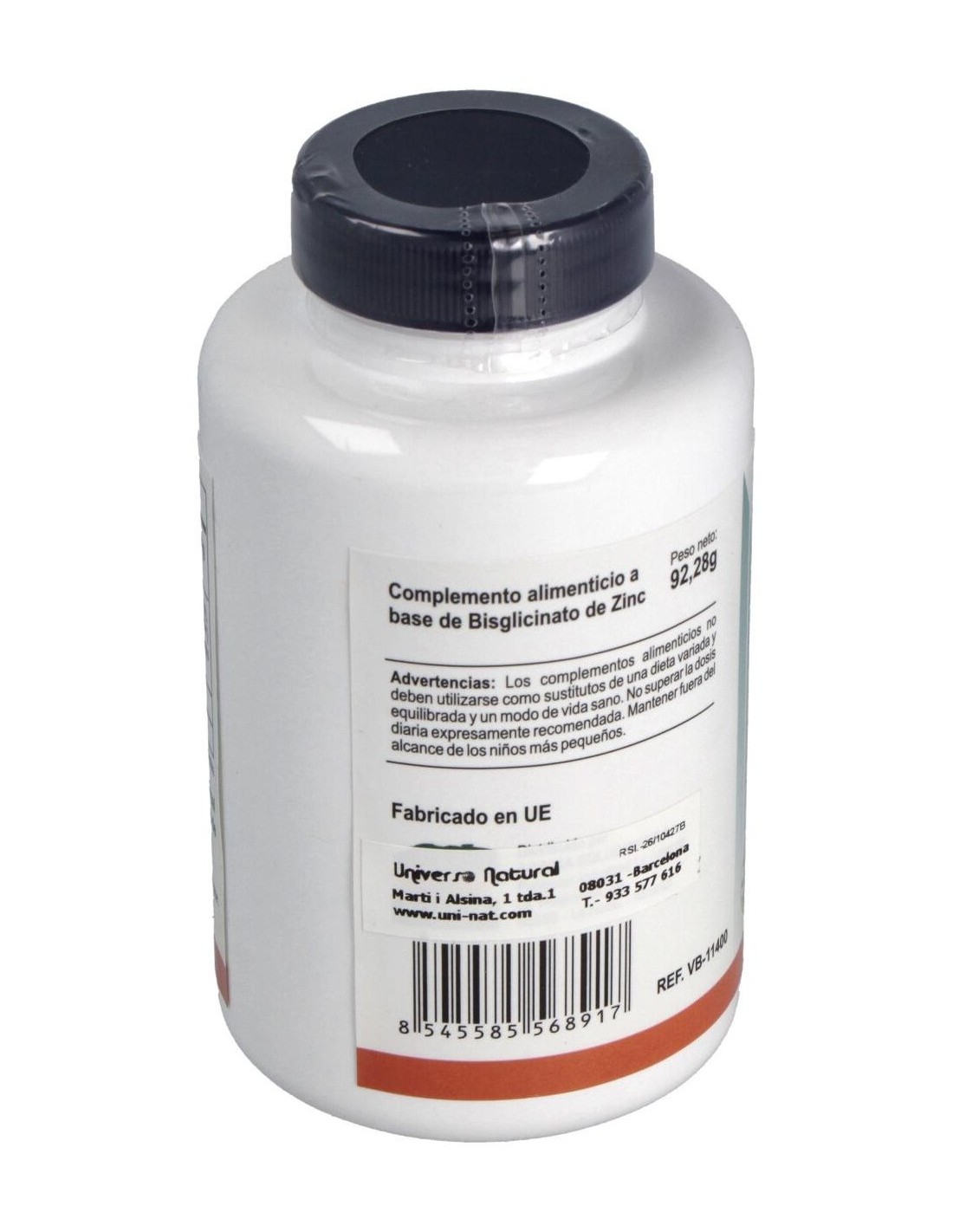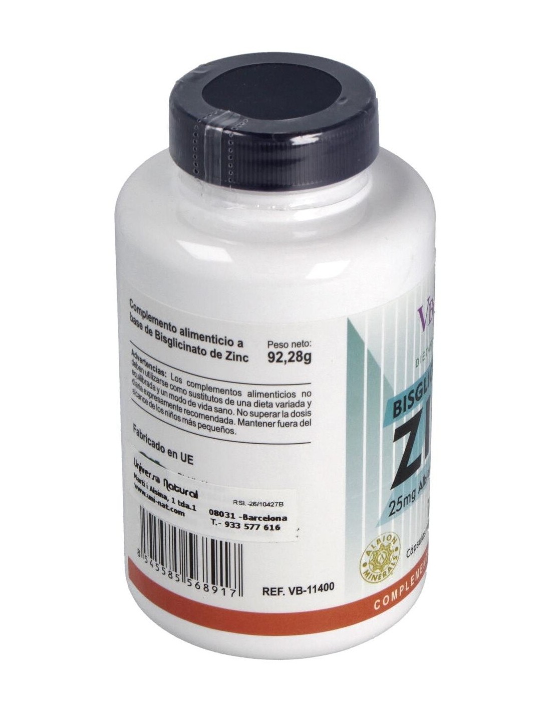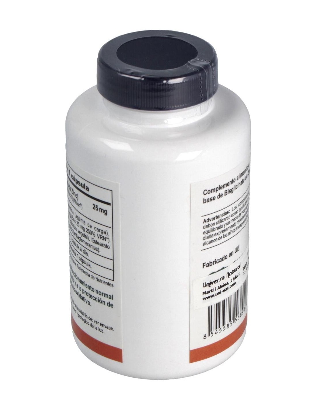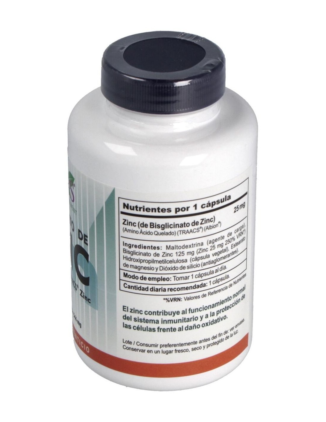 Zinc (Bisglicinato de Zinc), Maltrodextrina (agente de carga), Hidroxipropilmetilcelulosa (cápsula vegetal), Estearato de magnesio y dióxido de silicio (antiaglomerantes).