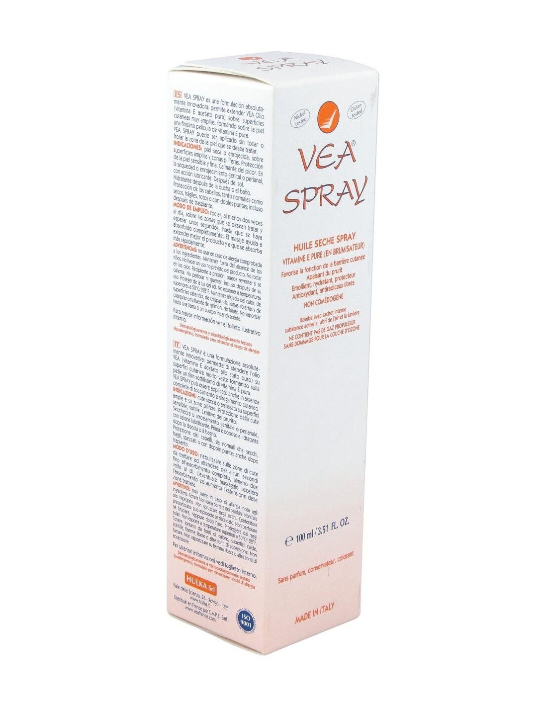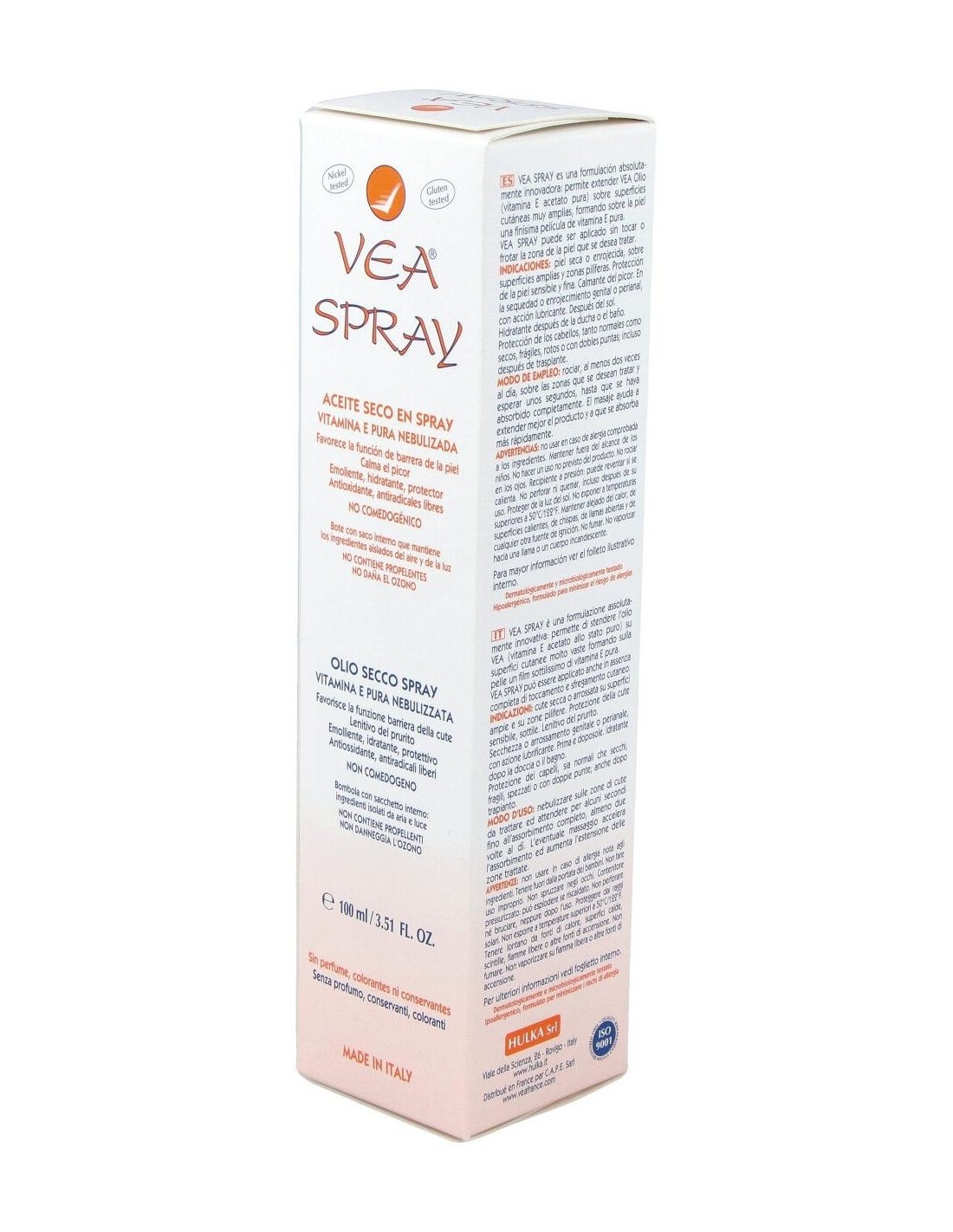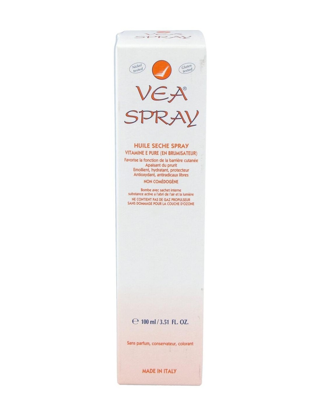 Vea Spray 100ml se trata de un aceite seco en formato spray elaborado a base de Vitamina E pura nebulizada. Indicado especialmente para pieles secas o enrojecidas. Su aplicación es muy sencilla y colabora con la prevención y atenuacón de estrías y como desmaquillante, incluso con el resistente al agua. No comedogénico. Actúa como hidratante tras la ducha y además, protege el cabello. No contiene agua, conservantes, perfumes, aceites esenciales ni colorantes, para minimizar el riesgo de alergias.