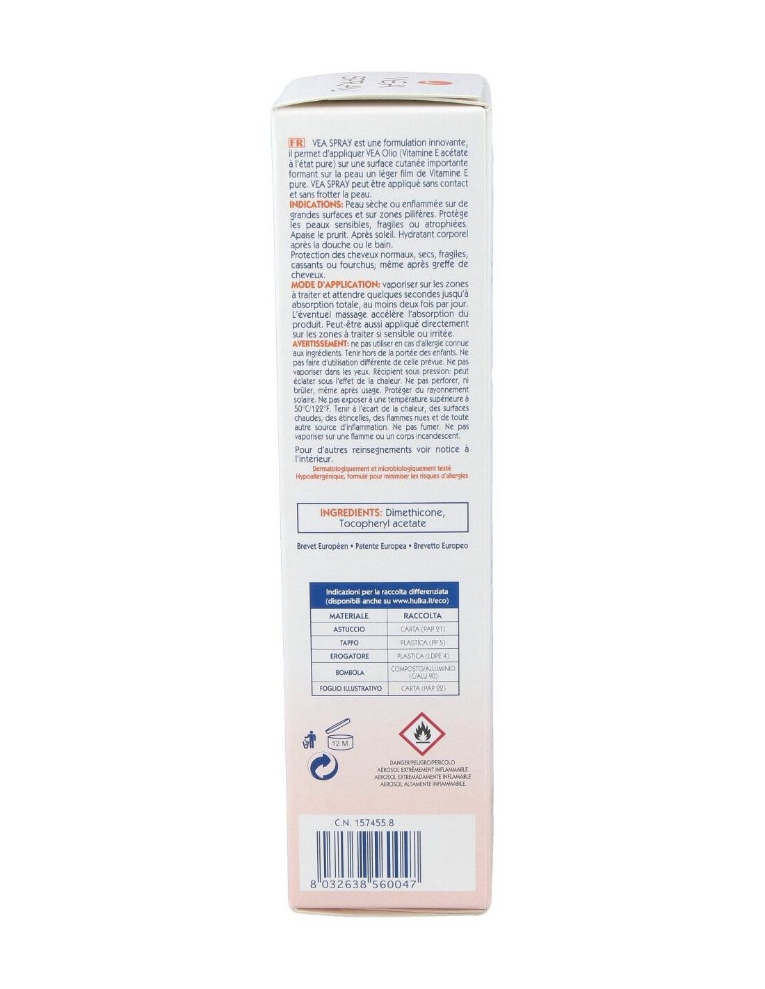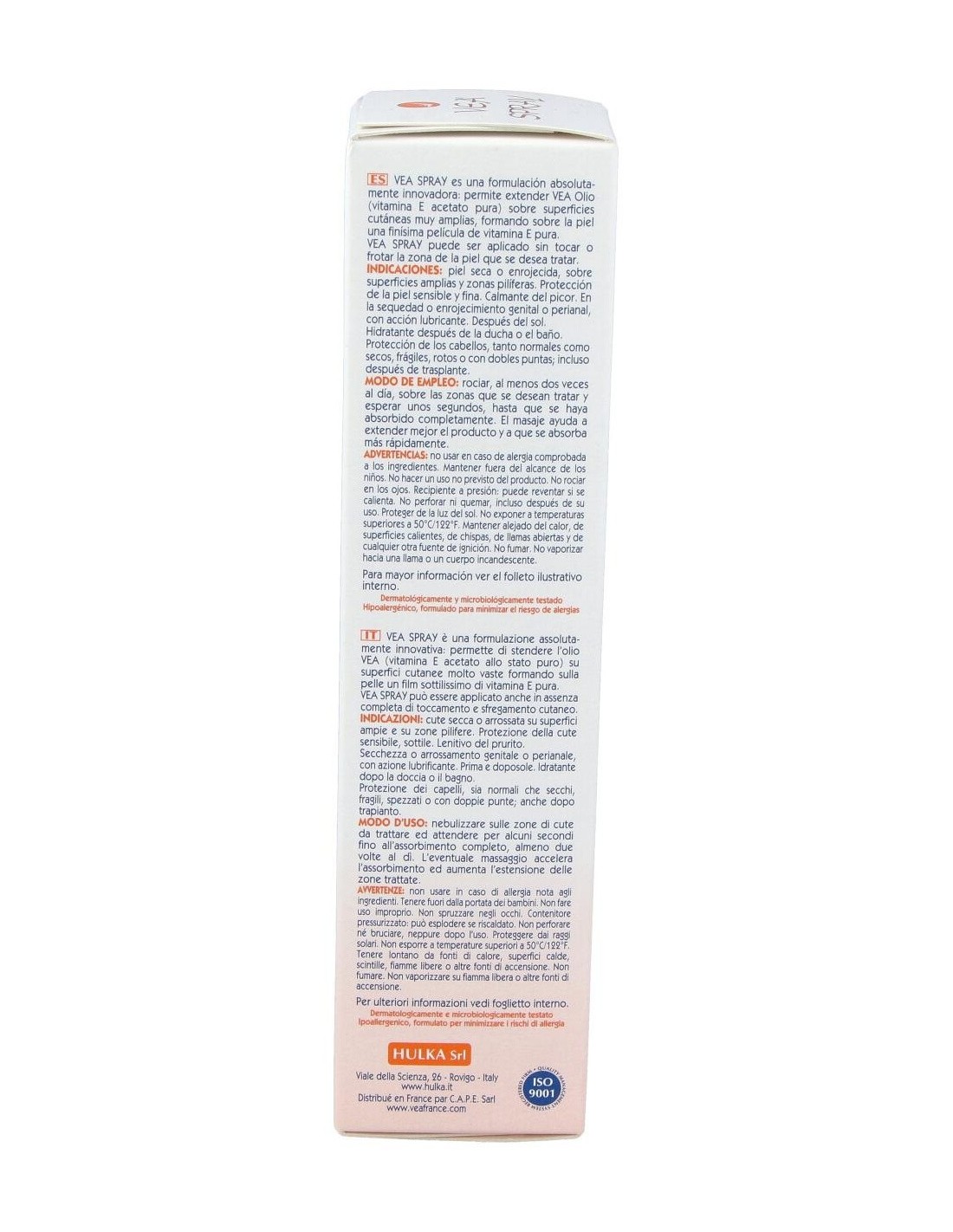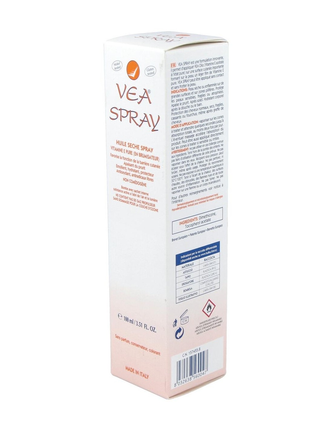 Vea Spray 100ml se trata de un aceite seco en formato spray elaborado a base de Vitamina E pura nebulizada. Indicado especialmente para pieles secas o enrojecidas. Su aplicación es muy sencilla y colabora con la prevención y atenuacón de estrías y como desmaquillante, incluso con el resistente al agua. No comedogénico. Actúa como hidratante tras la ducha y además, protege el cabello. No contiene agua, conservantes, perfumes, aceites esenciales ni colorantes, para minimizar el riesgo de alergias.