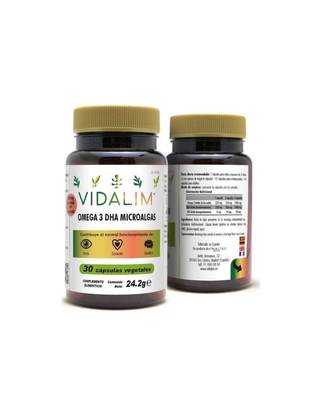 VIDALIMComplemento alimenticio de omega-3 DHA de aceite de microalgas. El DHA contribuye al normal funcionamiento de la visión, corazón y cerebro.