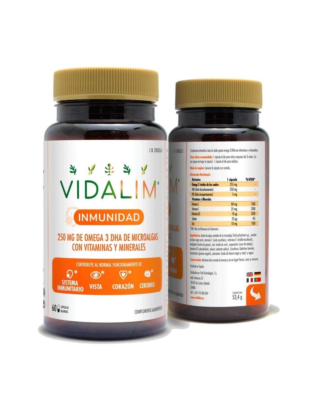VIDALIMComplemento alimenticio de omega-3 DHA, vitaminas y minerales en cápsulas para ingerir con las comidas. El DHA contribuye al normal mantenimiento del sistema inmune, vista, corazón y cerebro. Producto apto para niños a partir de 3 años.