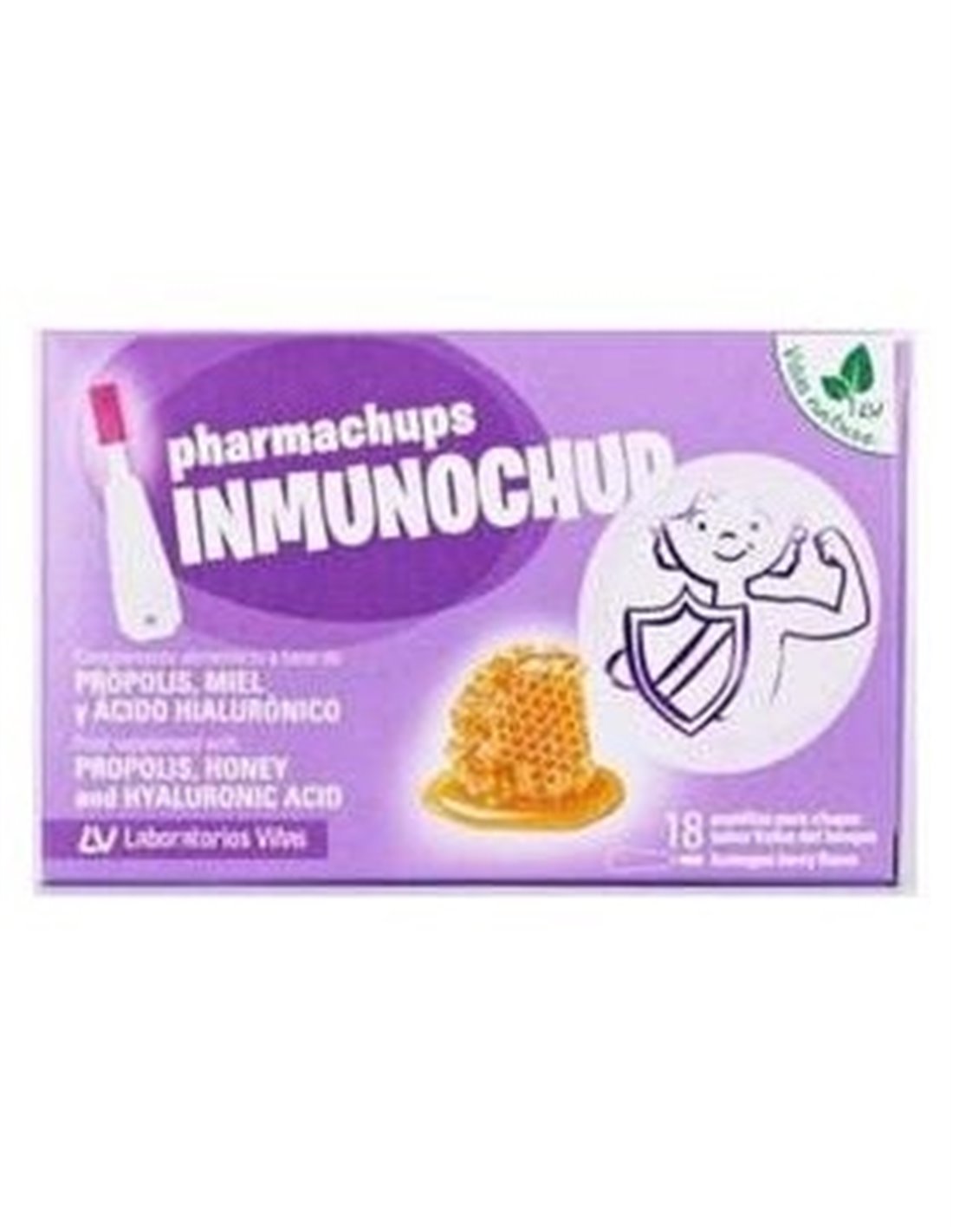 VIÑASPharmachups Inmunochup es un complemento alimenticio a base de própolis, vitaminas E y B6, ácido hialurónico y miel. La vitamina B6 contribuye al funcionamiento normal del sistema inmunitario y ayuda a disminuir el cansancio y la fatiga. La vitamina E contribuye a la protección de las células frente al daño oxidativo.\ Inmunochup se presenta en forma de pastilla para chupar y disolver en la boca, con un soporte plástico para evitar que se trague de golpe la pastilla y conseguir que al succionarla actúe lentamente. Su formato en una divertida piruleta y su sabor a frutas del bosque facilita la toma del producto a los más pequeños.