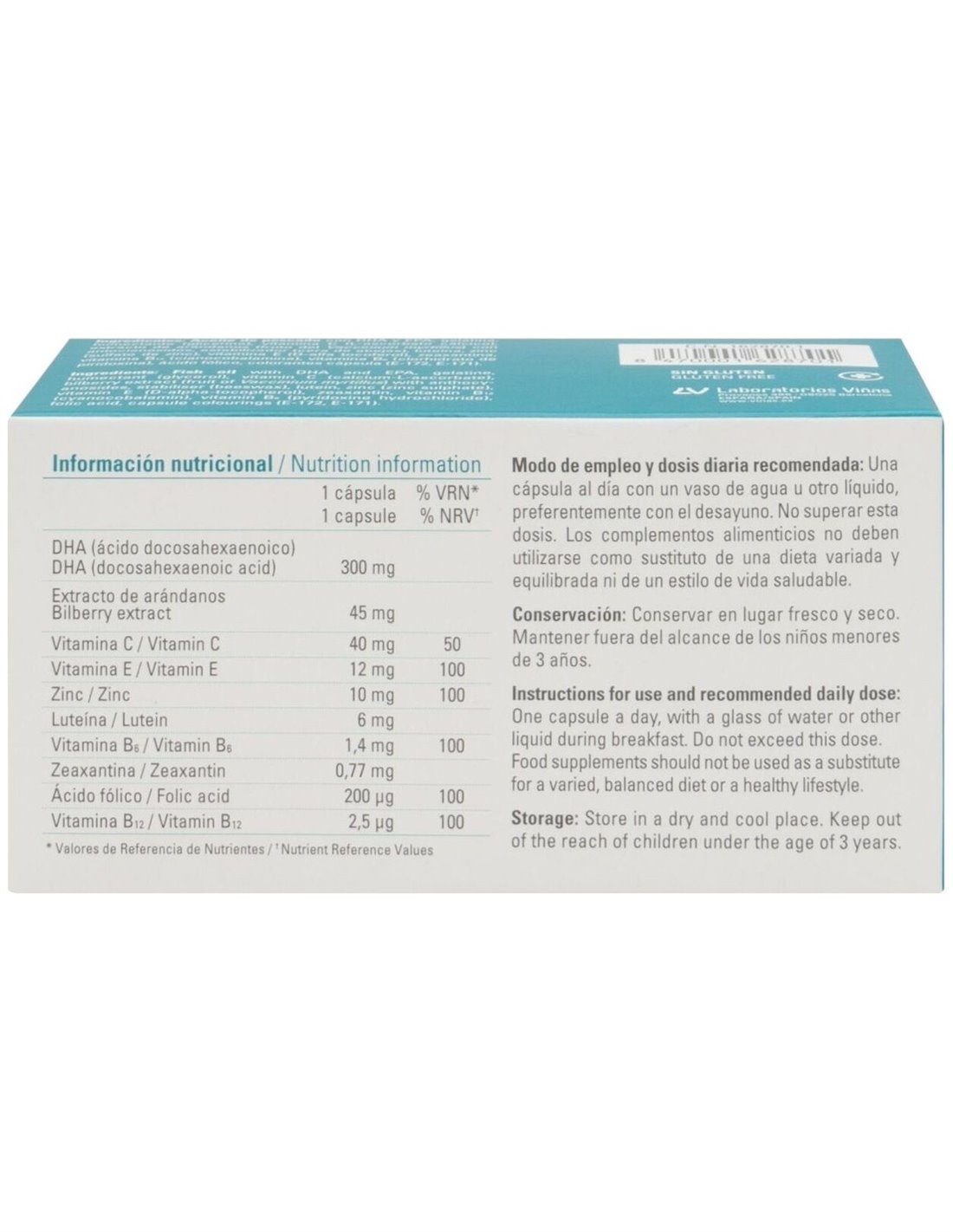 Principios activos: DHA (ácido docosahexaenoico), EPA (ácido eicosapentaenoico), ácidos grasos omega-3, zinc, luteína, zeaxantina, vitamina C, vitamina E, vitamina B6, vitamina B12, ácido fólico y extracto de arándano (Vaccinium myrtillus).