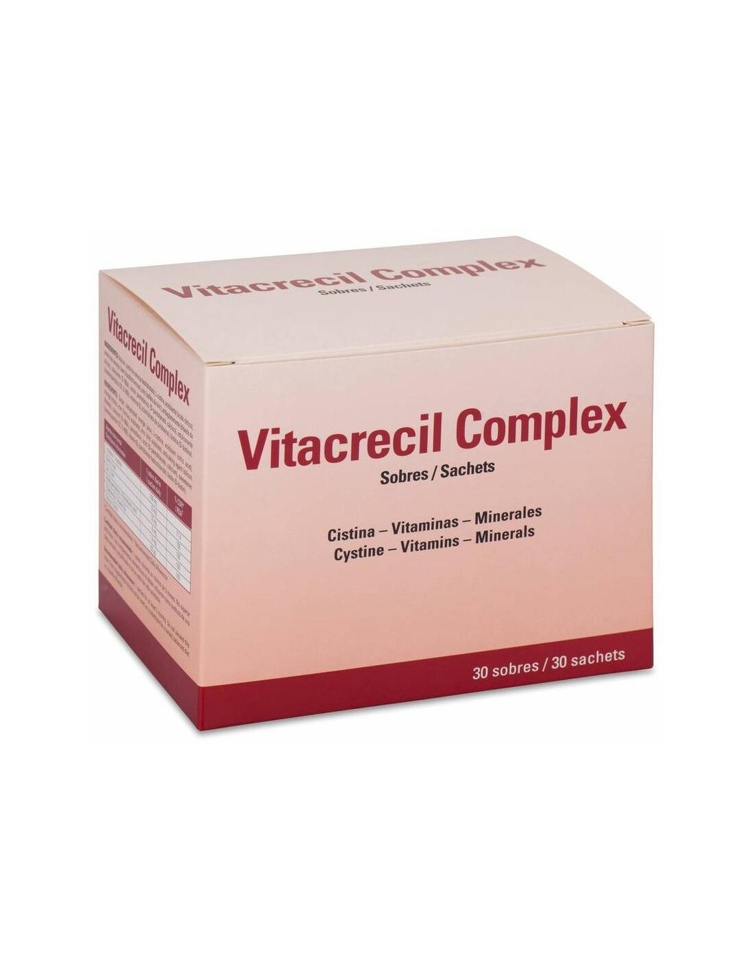 VITACRECILVitacrecil Complex es un complemento alimenticio con una combinación equilibrada de elementos nutritivos para la nutrición de cabellos y uñas. Una ingesta adecuada de zinc es uno de los factores que ayudan a mantener el cabello y las uñas en\ condiciones normales. La biotina es una vitamina cuyo aporte dietético suficiente contribuye al normal mantenimiento del cabello. La cistina es un aminoácido azufrado constitutivo de la queratina. Apto para intolerantes a la lactosa.