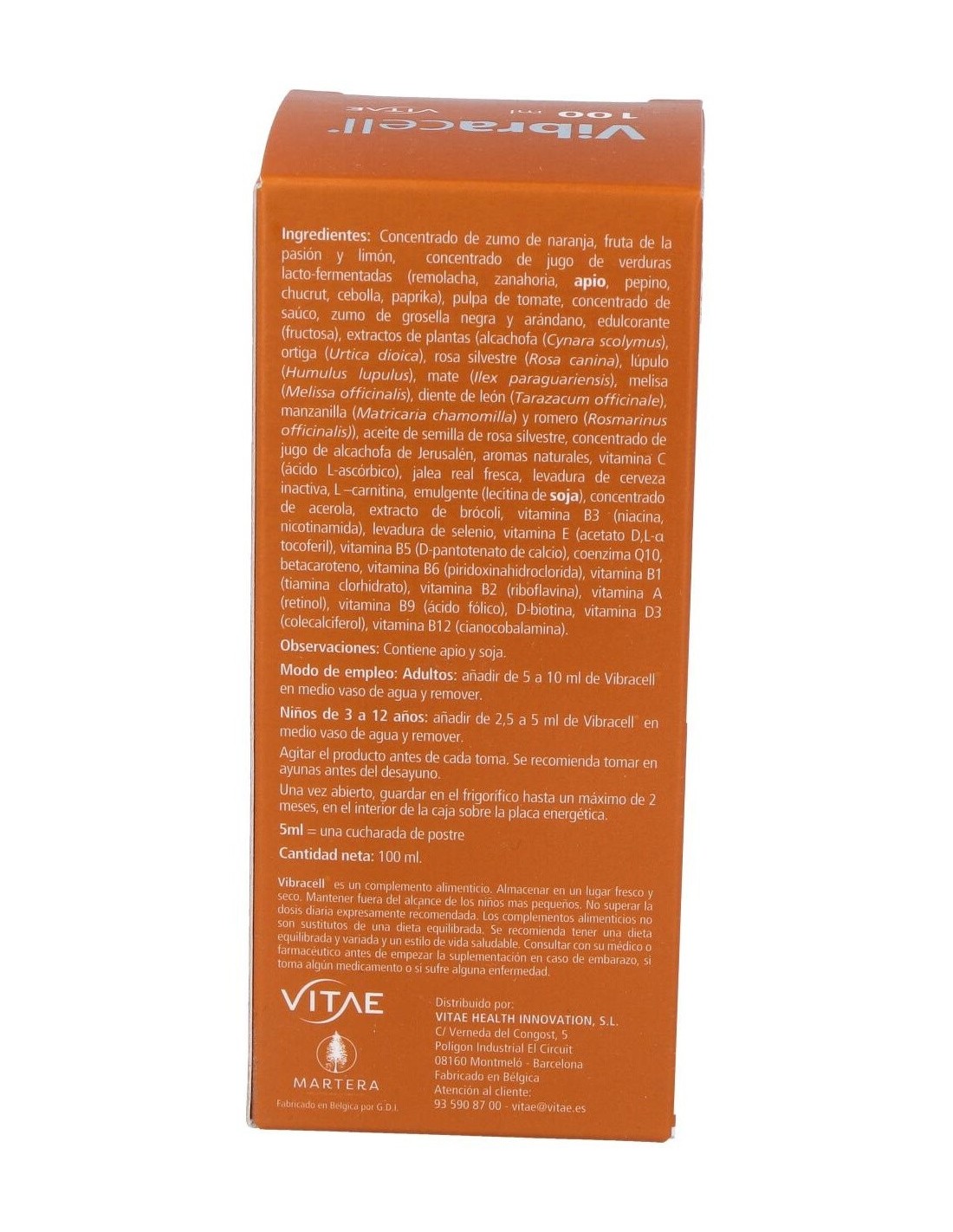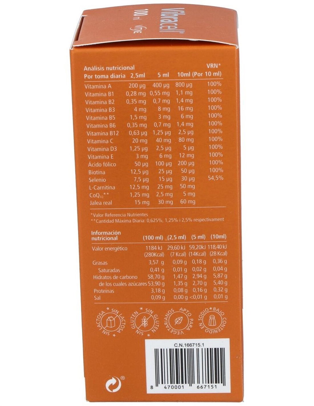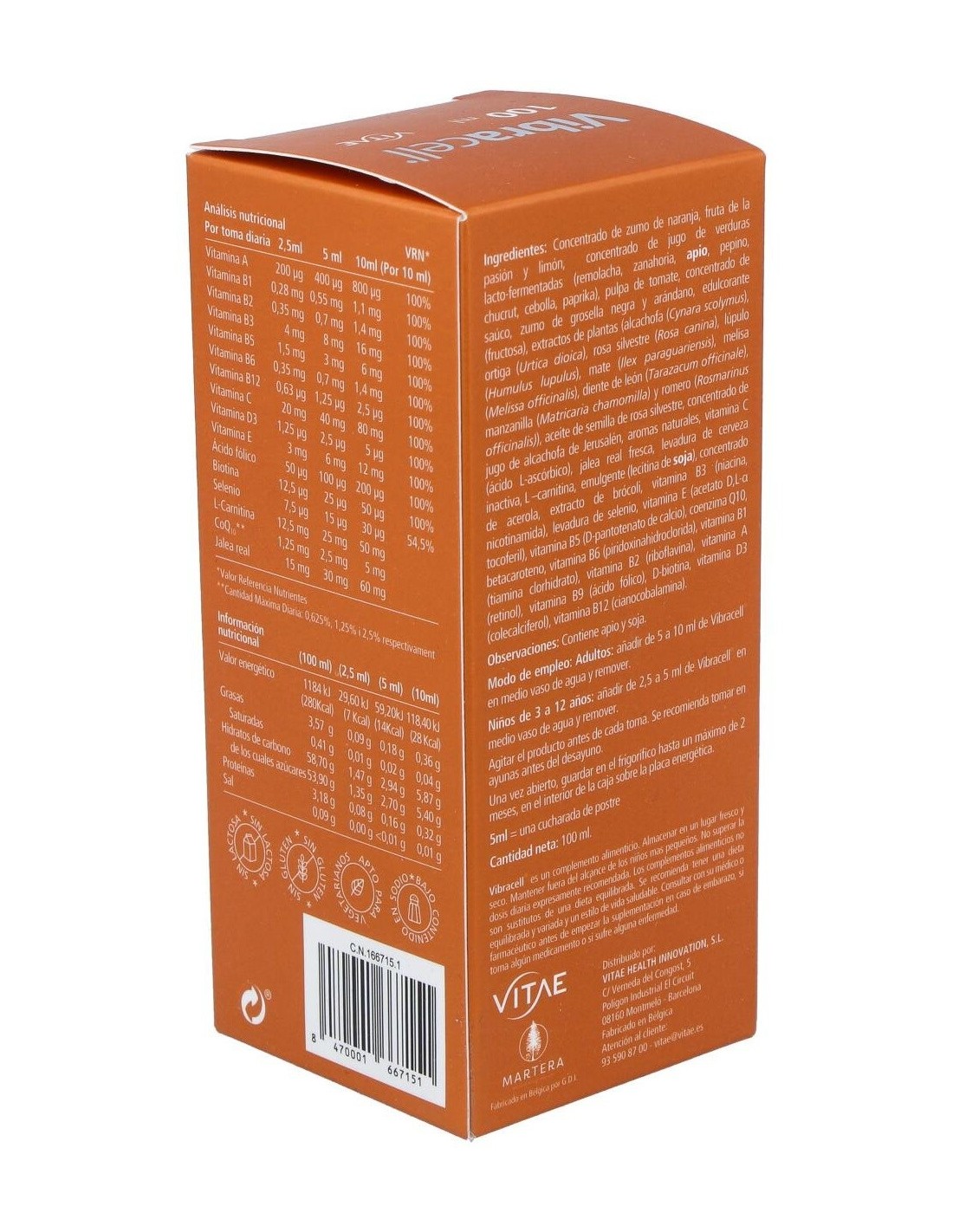 Concentrado de zumo de naranja, fruta de la pasión y limón, concentrado de jugo de verduras lacto-fermentadas (remolacha, zanahoria, apio, pepino, chucrut, cebolla, papikra), pulpa de tomate, concentrado de saúco, zumo de grosella negra y arándano, fructosa, extracto de plantas (alcachofa, ortiga, rosa silvestre, lúpulo, mate, melisa, diente de león, manzanilla, romero), aceite de semilla de rosa silvestre, concentrado de jugo de alcachofa de Jerusalén, armas naturales, ácido ascórbico, jalea real fresca, levadura de cerveza inactiva, L-carnitina, lecitina de soja, concentrado de acerola, extracto de brócoli, niacina, nicotinamida, levadura de selenio, acetato dl alfa tocoferilo, D-pantotenato de calcio, coenzima Q10, betacaroteno, piridoxinahidroclorida, tiamina clorhidrato, riboflavina, retinol, ácido fólico, D-biotina, colecalciferol, cianocobalamina.