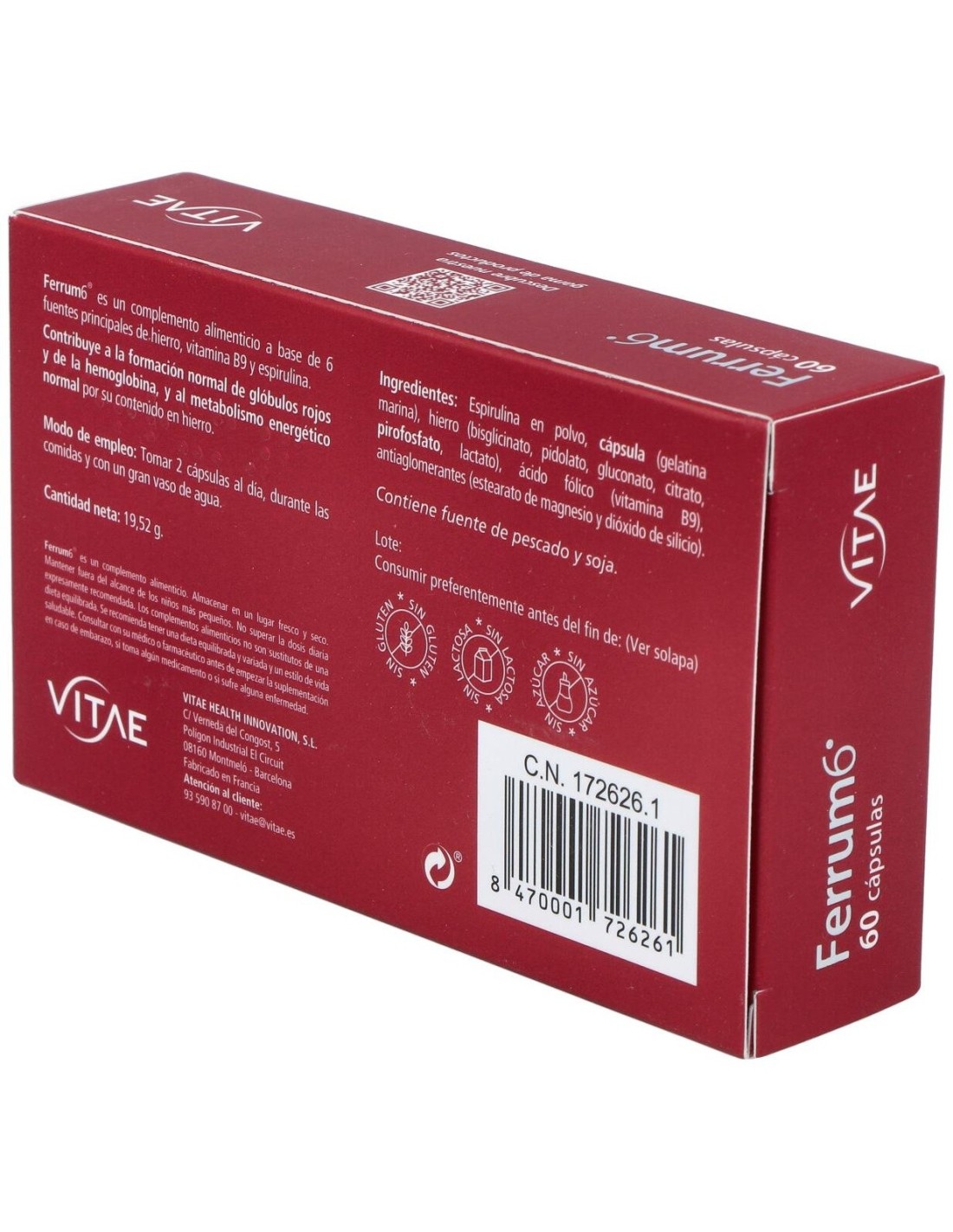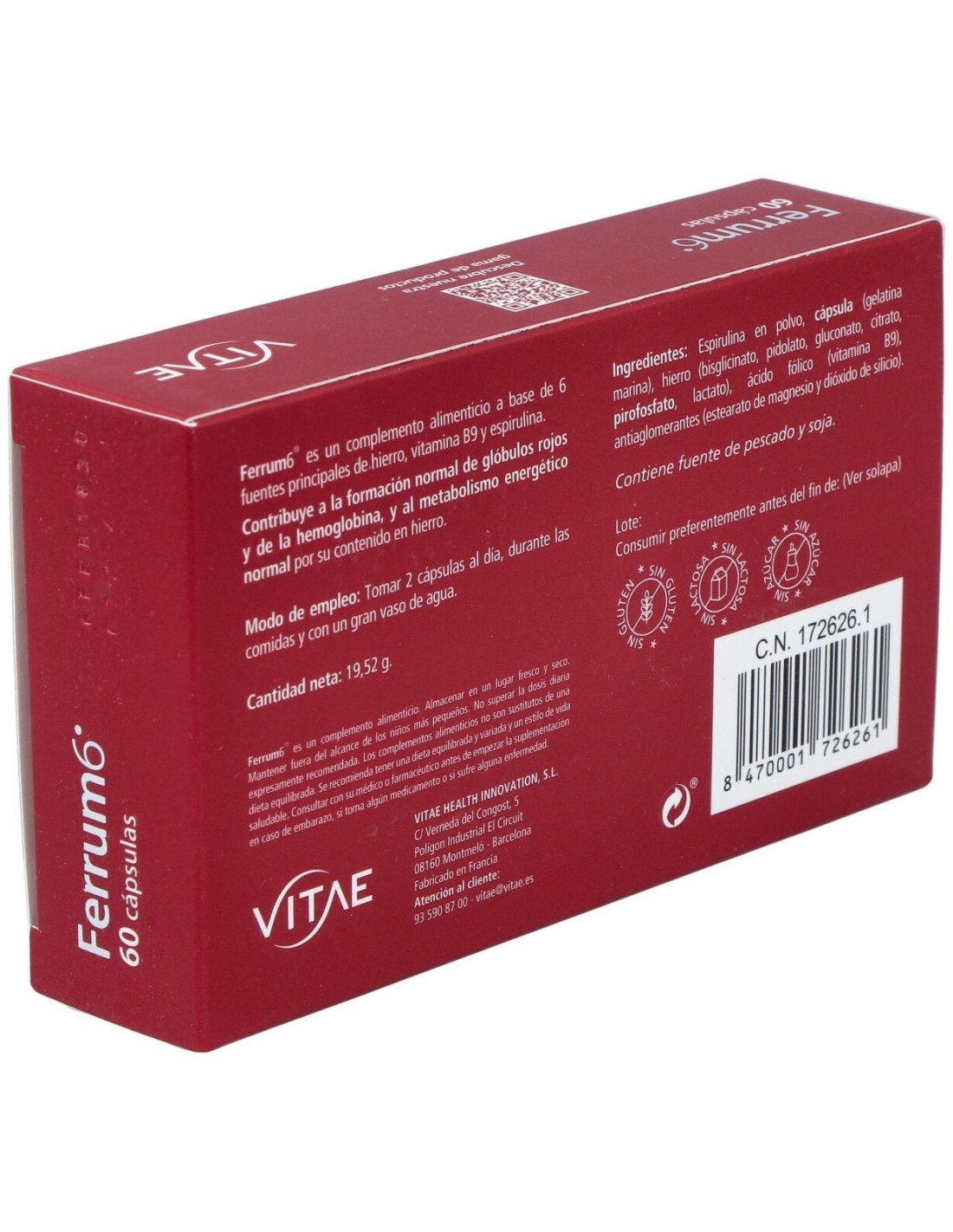 Vitae Ferrum6 60 cápsulas es un suplemento formulado con 6 fuentes distintas de hierro (bisglicinato, pidolato, citrato, gluconato, pirofosfato, lactato), ácido fólico y espirulina. Contribuye a la formación normal de glóbulos rojos y de hemoglobina, además de oxigenar el cuerpo. Además, ayuda a disminuir el cansancio y la fatiga.