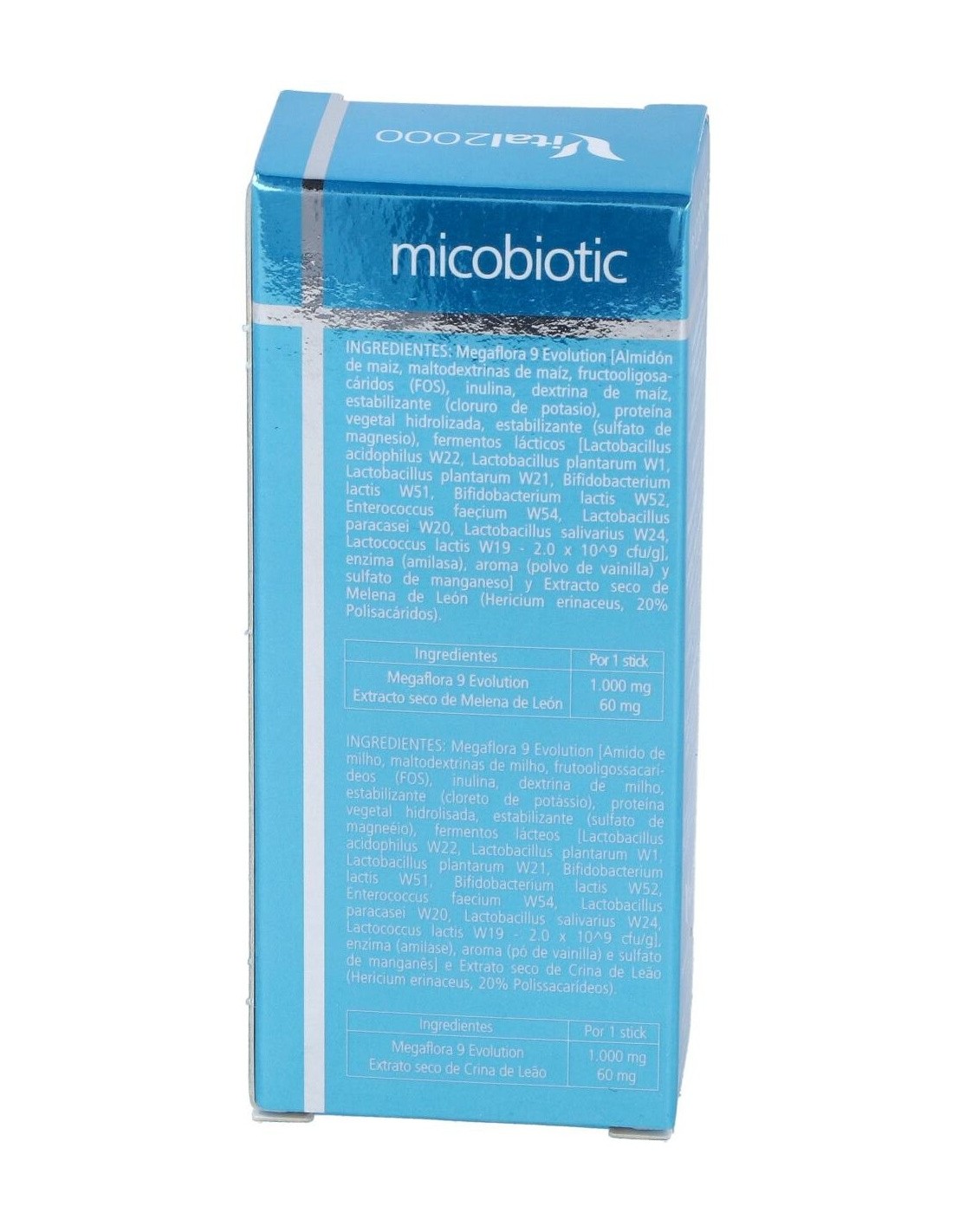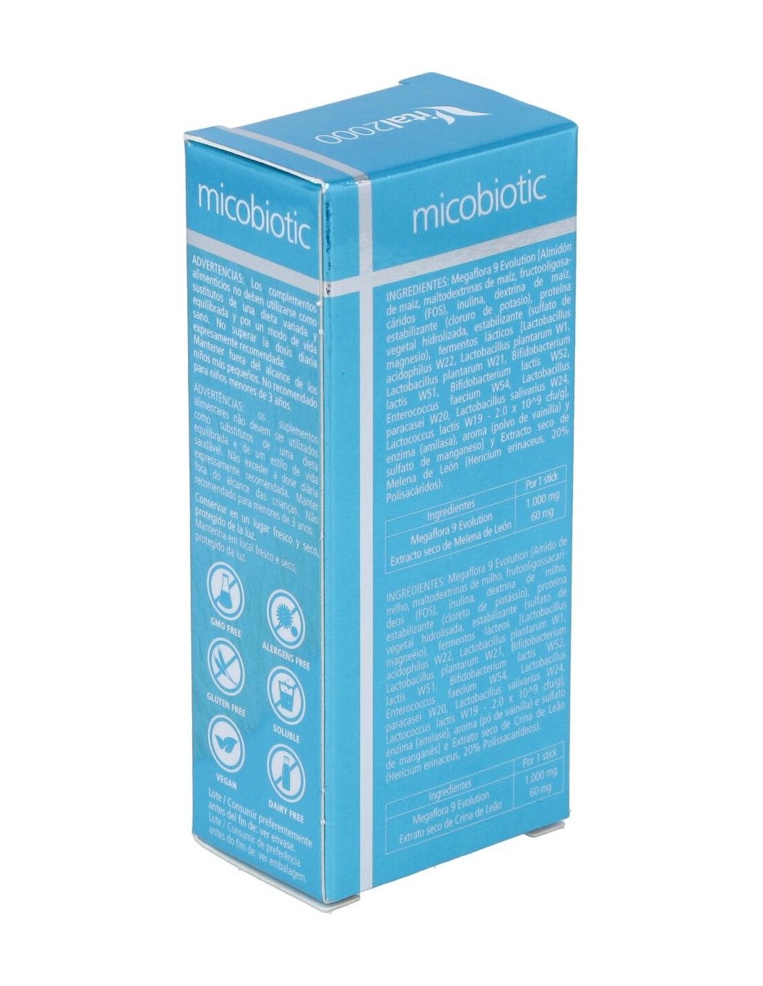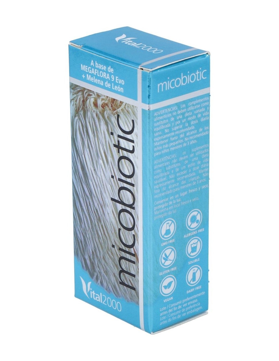 60 mg de melena de león (Hericium erinaceus) (20% en polisacáridos). 1.000 mg de megaflora 9 evo® (aporta 2000 millones ufc/g) (Lactobacillus acidophilus W22, Lactobacillus plantarum W1, Lactobacillus plantarum W21, Bifidobacterium lactis W51, Bifidobacterium lactis W52, Enterococcus faecium W54, Lactobacillus paracasei W20, Lactobacillus salivarius W24, Lactococcus lactis W19). Complejo prebiótico (matriz orgánica y mineral) con tecnología ProbioAct®: que garantiza una supervivencia y actividad superior al 90%: Almidón de maíz, maltodextrinas de maíz, fructooligosacáridos (FOS), inulina, dextrina de maíz, estabilizante (cloruro de potasio), proteína vegetal hidrolizada, estabilizante (sulfato de magnesio), enzima (amilasa), aroma (polvo de vainilla) y sulfato de manganeso.