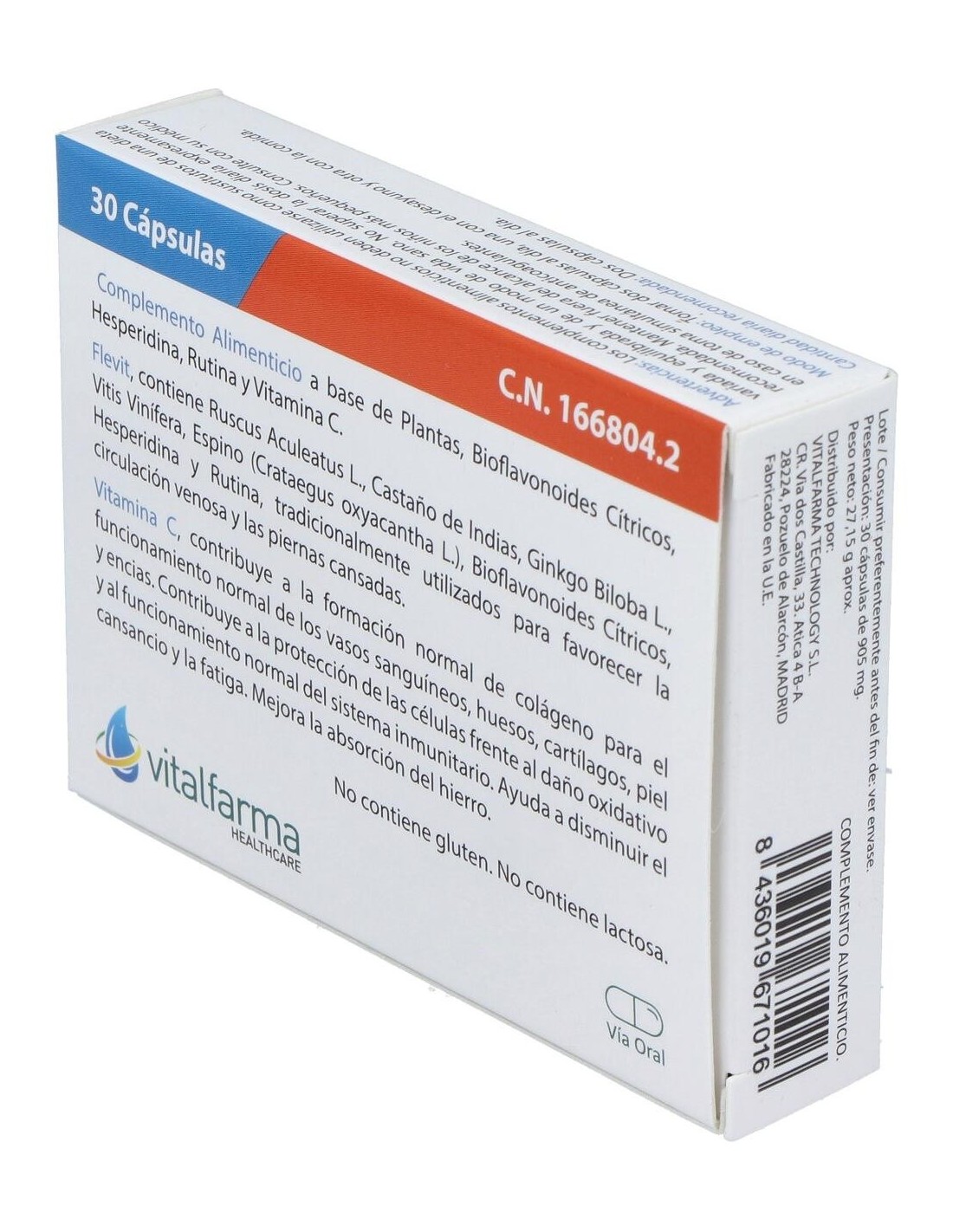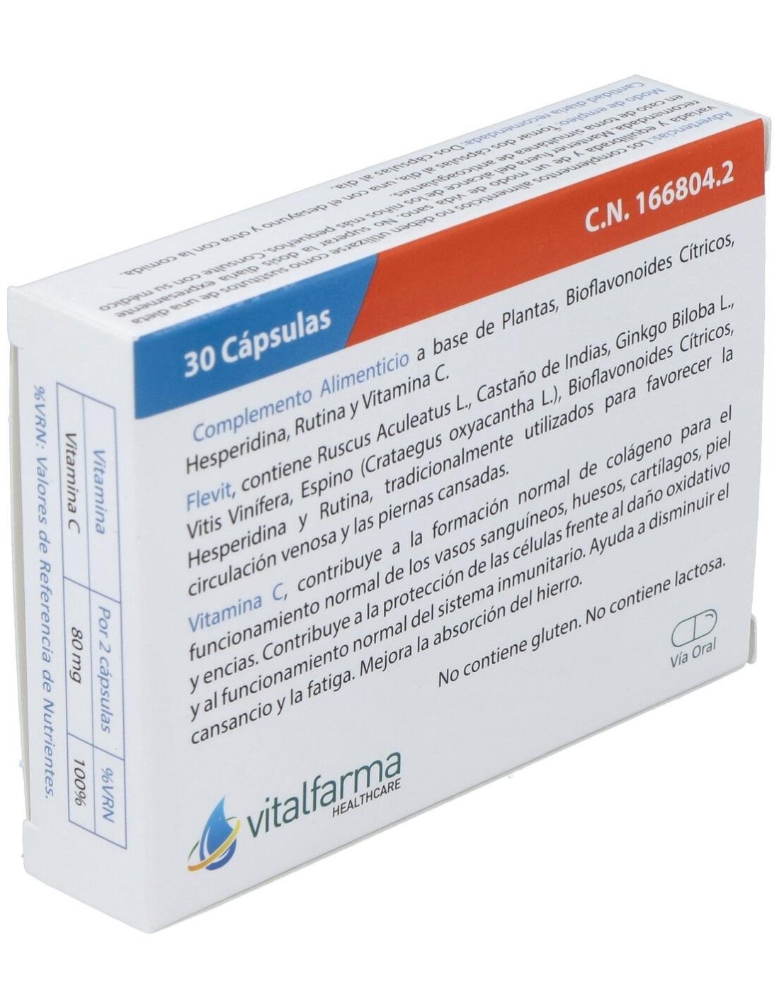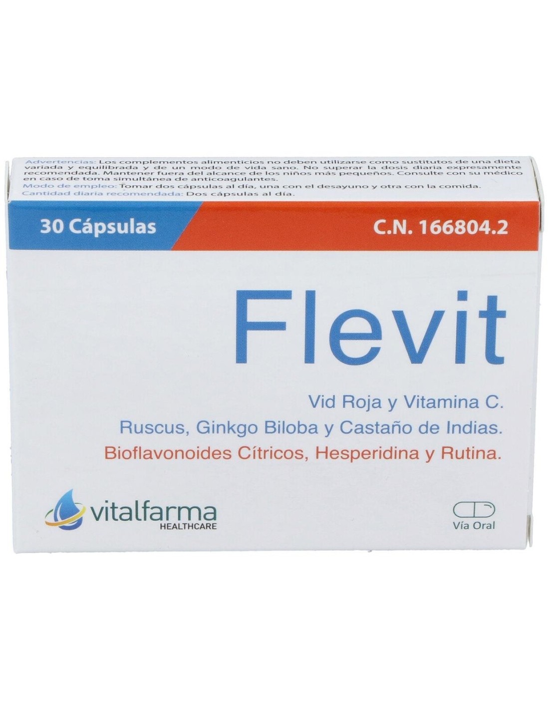 Flevit es un complemento alimenticio formulado con ruscus, castaño de indias, ginko biloba, vid roja, bioflavonoides, rutina, hesperidina y vitamina C para el correcto funcionamiento de nuestro organismo. Contribuye a la formación de colágeno para el funcionamiento normal de la piel y los vasos sanguíneos.