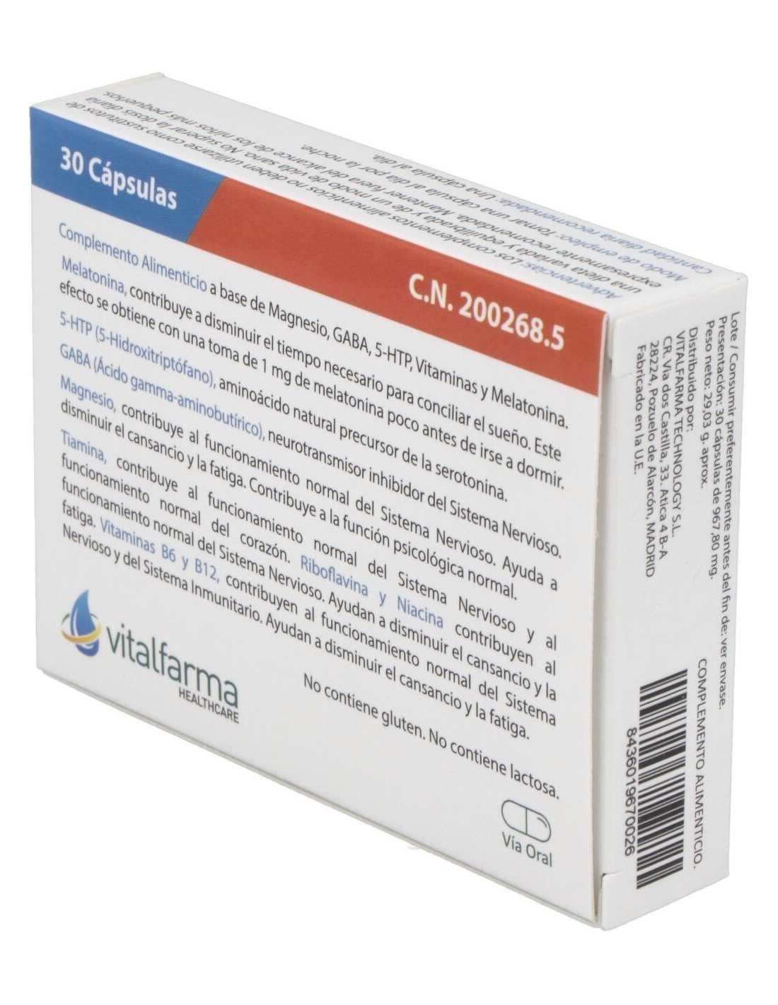 Complemento alimenticio a base de Melatonina, 5-HTP (5-Hidroxitriptófano), GABA (Ácido gamma aminobutírico), Magnesio y Vitaminas B1, B2, B3, B6 y B12. La rica composición favorece al sueño y descanso. Contribuyen al funcionamiento normal del Sistema Nervioso y del Sistema Inmunitario. Ayudan a disminuir el cansancio y la fatiga. Protege a las células del daño oxidativo.