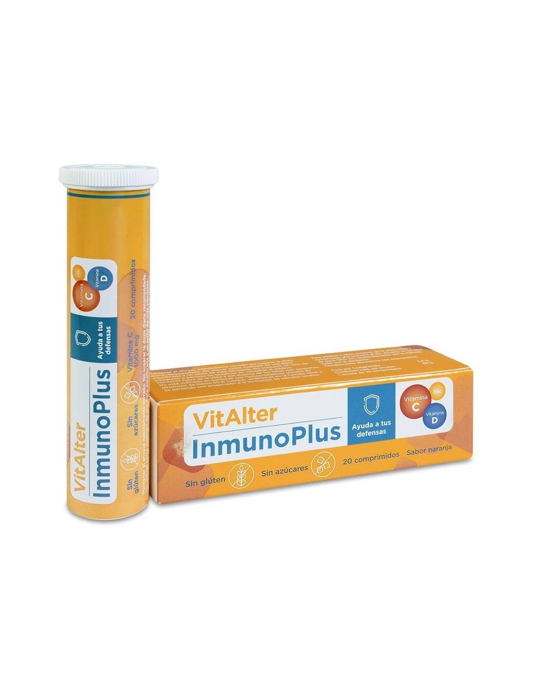 VITALTERVitAlter Inmunoplus es un complemento alimenticio en comprimidos efervescentes que contienen Vitamina C, Zinc y un extra de Vitamina D, que ayuda al normal funcionamiento del sistema inmunitario. La combinación de Vitamina C, D y Zinc contribuye al normal funcionamiento del sistema inmunitario a todos sus niveles de defensa frente a las agresiones externas, contaminación ambiental, tabaquismo o estrés. La Vitamina C ayuda a reducir el cansancio y la fatiga y mejora la absorción del hierro. Además, contribuye a la formación del colágeno que favorece el normal\ funcionamiento de huesos, vasos sanguíneos, cartílagos, encías, piel y dientes.\ La Vitamina D ayuda al mantenimiento normal de los huesos, músculos y dientes. El Zinc contribuye al mantenimiento de huesos, visión, cabello, uñas y piel en condiciones normales.