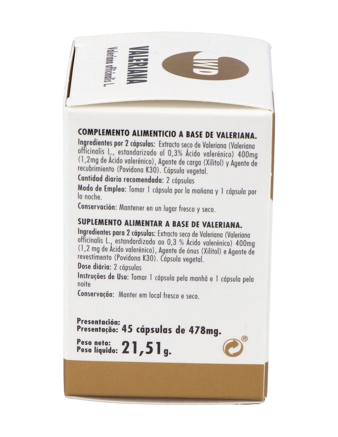 Valeriana (Valeriana officinalis L.) 400 mg, Agente de carga (Xilitol), Agente de recubrimiento (Povidona K30). Cápsula vegetal.