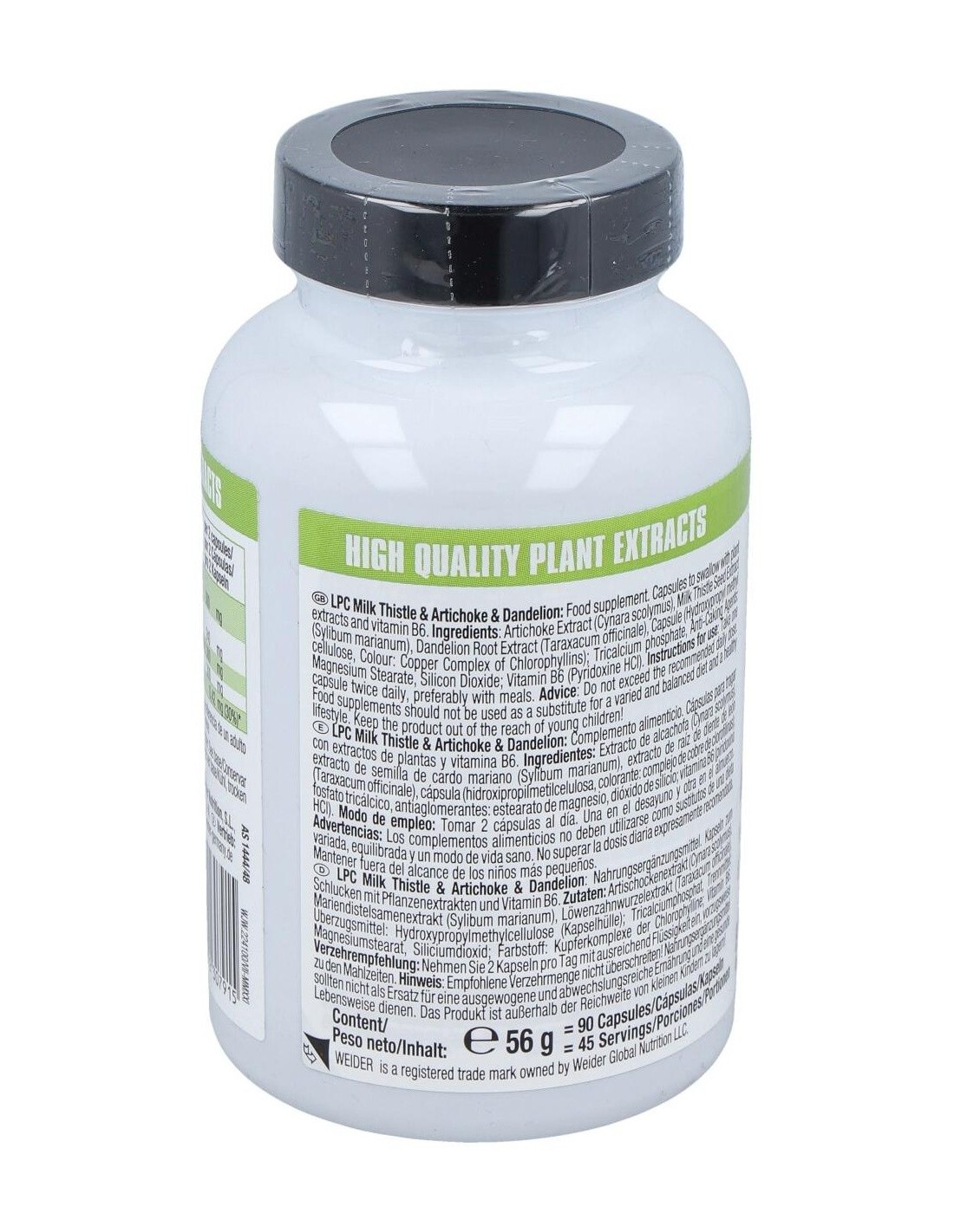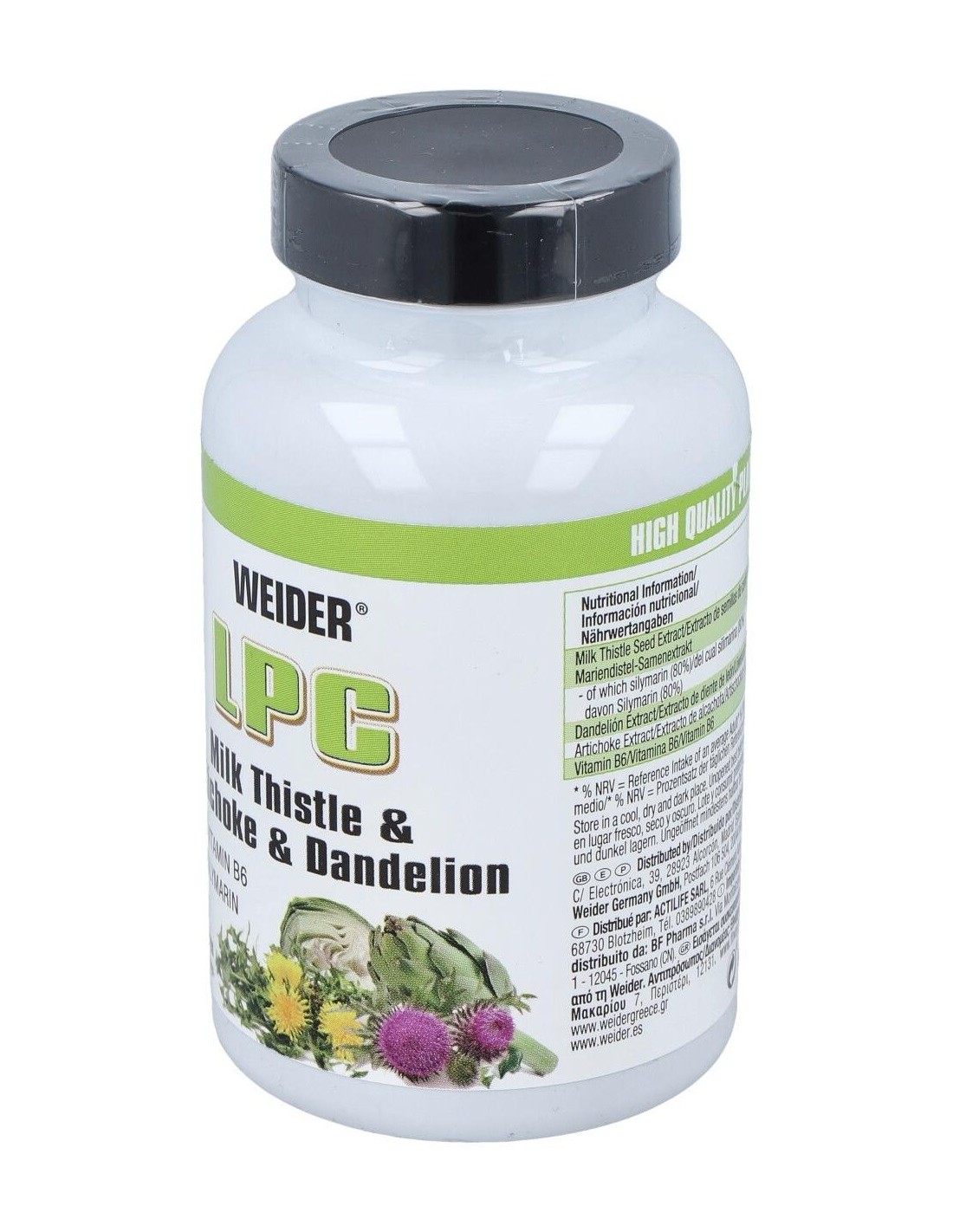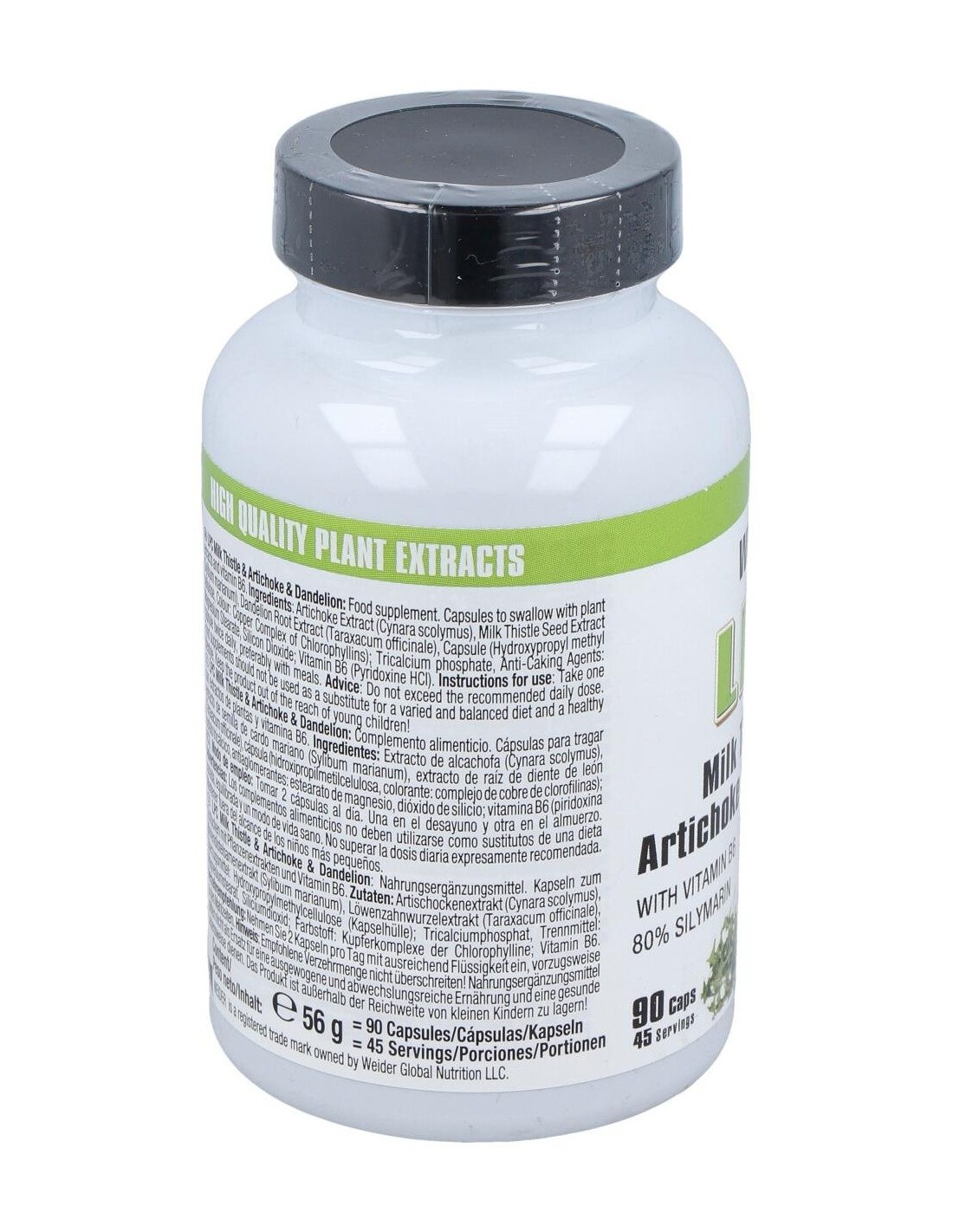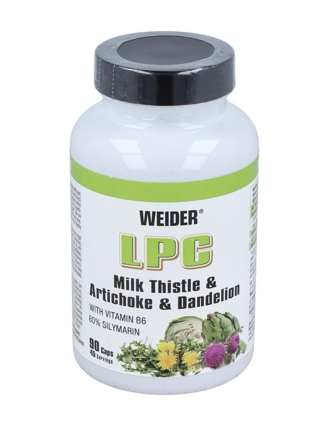 Weider LPC contiene cápsulas enriquecidas con con cardo mariano (80% silimarina), diente de Léon, alcachofa y vitamina B6. Su combinación lo hace ideal para una protección adecuada del sistema hepático.