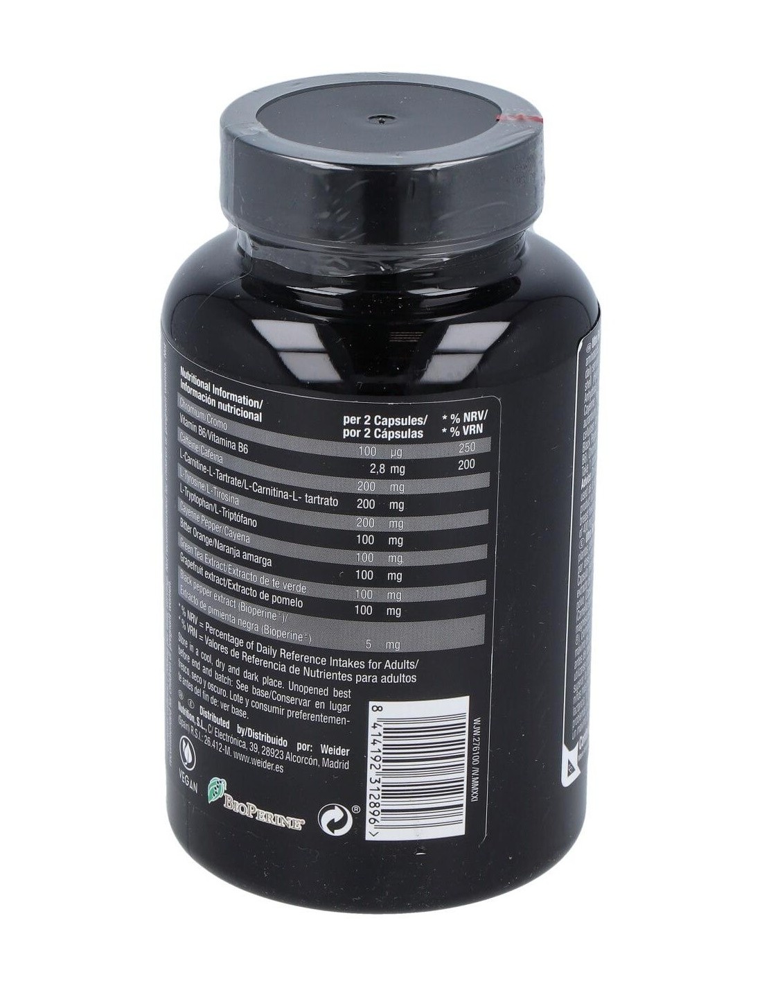 cápsula (Hidroxipropil metilcelulosa), L-carninina L-tartrato, cafeína anhidra, L-tirosina, L-triptófano, cayena en polvo (Capsicum frutescens), naranja amarga (Citrus aurantium), extracto de té verde (Camellia Sinensis L.), extracto de naringina (Citrus grandis), antiaglomerantes: dióxido de silicio, sales magnésicas de ácidos grasos; pimienta negra (Piper nigrum) (Bioperine®), clorhidrato de piridoxina (Vitamina B6), picolinato de cromo.