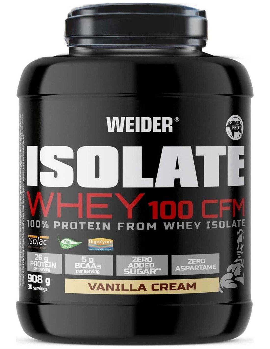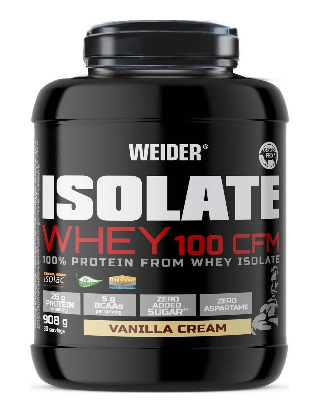 WEIDERIsolate Whey 100 CFM es una proteína de suero de leche 100% aislada, de máxima pureza y calidad Premium (Isolac®). Está enriquecida con enzimas digestivas (Digezyme®) y no contiene azúcar, ni prácticamente grasa. Su combinación de ingredientes es perfecta para recuperar después de cada entrenamiento. Para esta proteína, Weider utiliza técnicas avanzadas de extracción mecánica en frío (CFM), que consigue un porcentaje de proteína cercano al 90% y mantiene intactas sus propiedades. Como resultado obtenemos un aislado de rápida absorción, con un aminograma excelente y naturalmente muy rico en BCAAs, aminoácidos fundamentales para la función muscular.