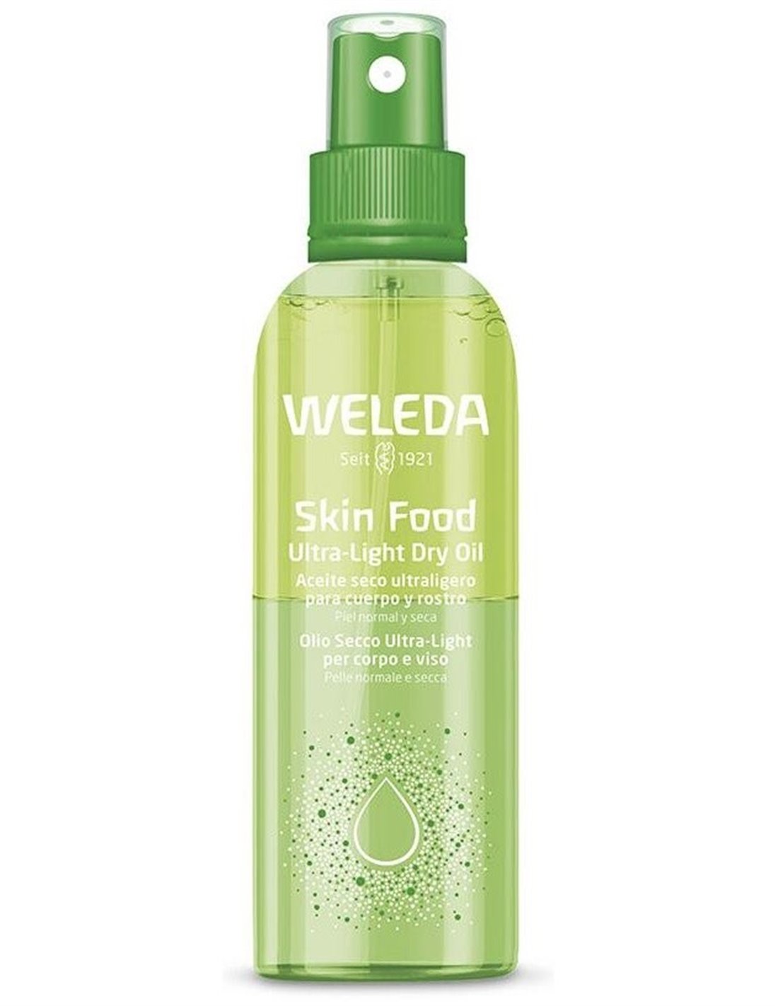 WELEDAAceite iluminador nutritivo de textura ultraligera en formato spray. Con todos los beneficios de la fórmula Skin Food. Rápida absorción y sensación no grasa. 24 horas de hidratación y luminosidad natural gracias a sus aceites vegetales nutritivos. La piel se hidrata al instante, su fórmula ligera regenera la barrera protectora natural de la piel y la protege frente a la sequedad. Recomendado para pieles normales a secas. Rostro y cuerpo. Tipo de belleza para el rostro: a modo de iluminador.