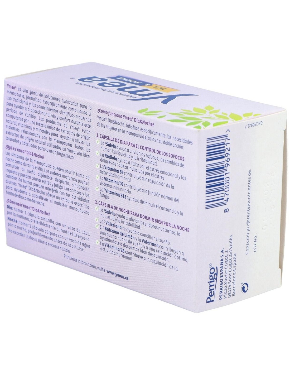 Ymea Experto en Menopausia Día y Noche 64caps es un complemento alimenticio natural a partir de extractos de plantas, como la salvia, y vitamina B6, indicado para mujeres durante la menopausia.