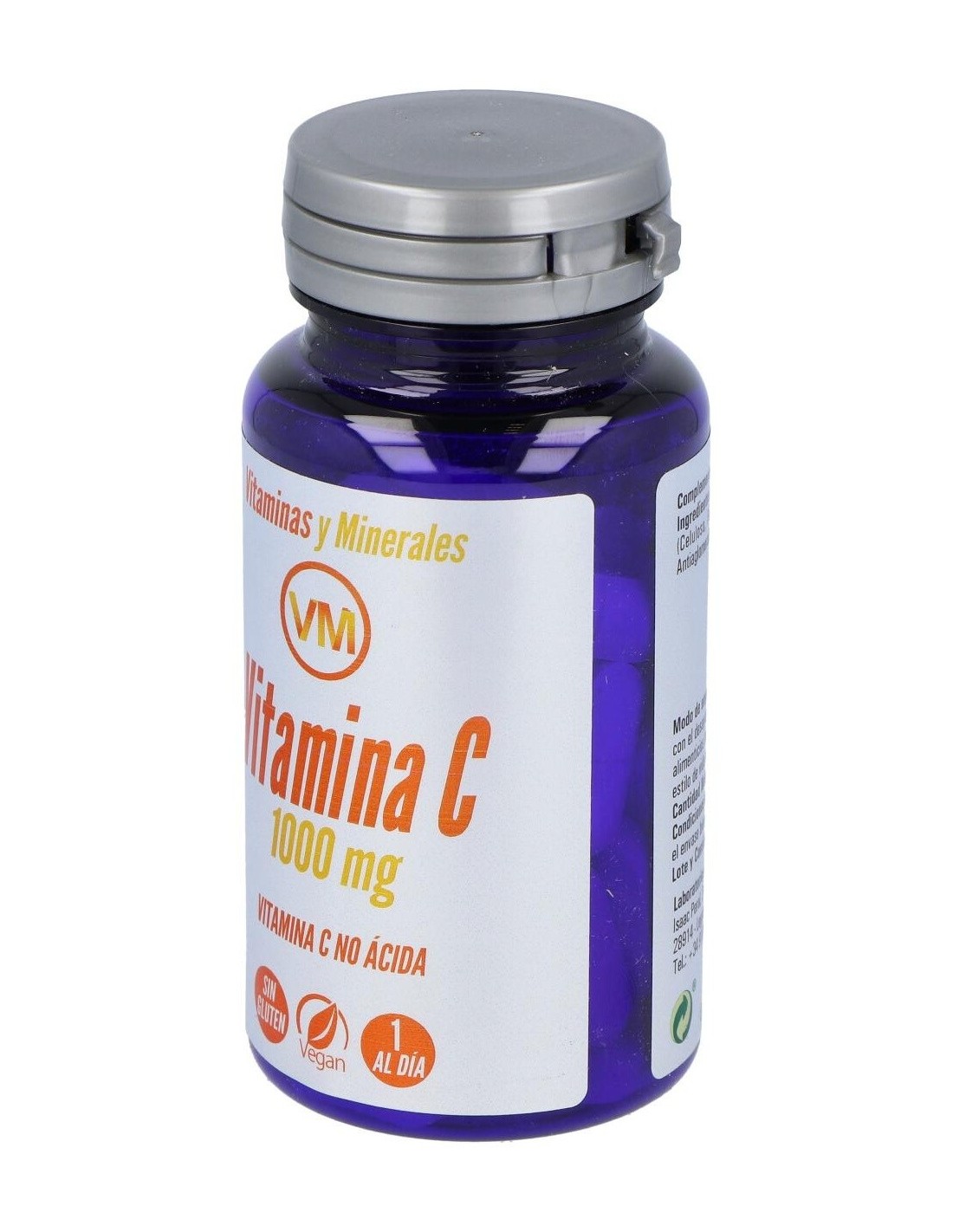 Vitamina C (Ascorbato sódico): 1131 mg, Agentes de carga (Celulosa, Fosfatos de calcio, Hidroxipropilcelulosa, Carboximetilcelulosa sódica), Antiaglomerantes (Monoglicéridos de ácidos grasos, Dióxido de silicio, Estearato de magnesio).